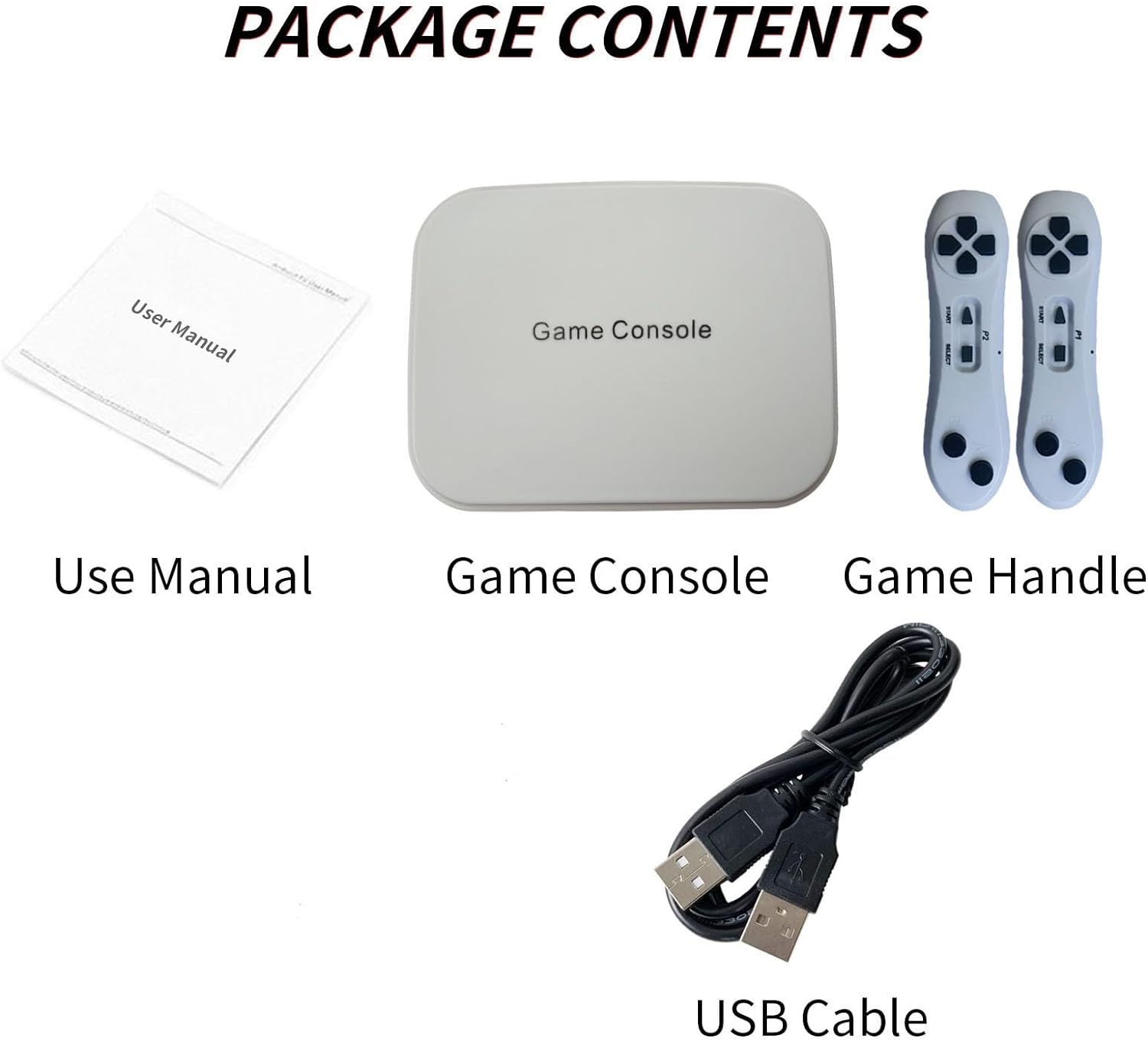 1*game console, 2*game controllers with handle, 1*power charger, 1*USB cable, 1*HD cable, 1*English use manual.