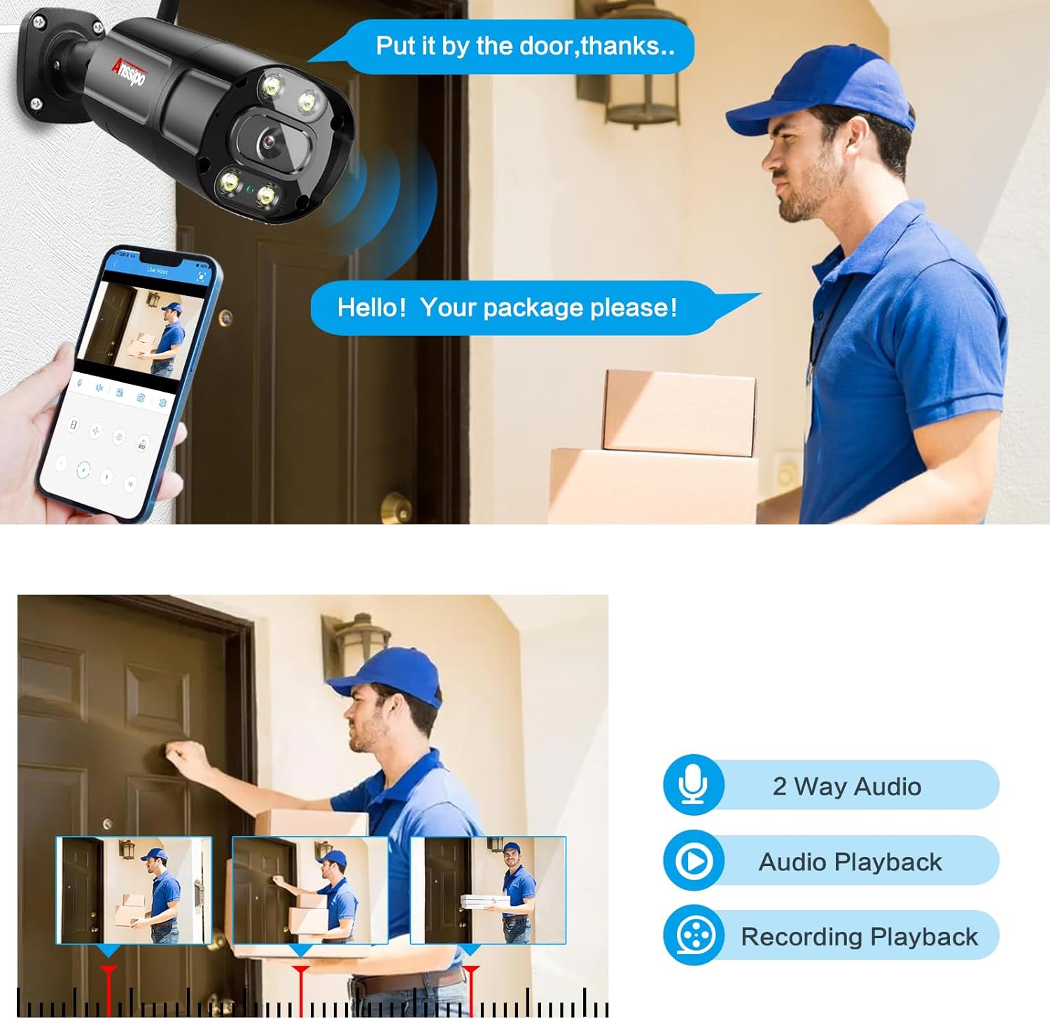 1 Dual Warnings 2 Two-Way Audio 3 IP66 Waterproof 4 Remote Control 5 Package Contents