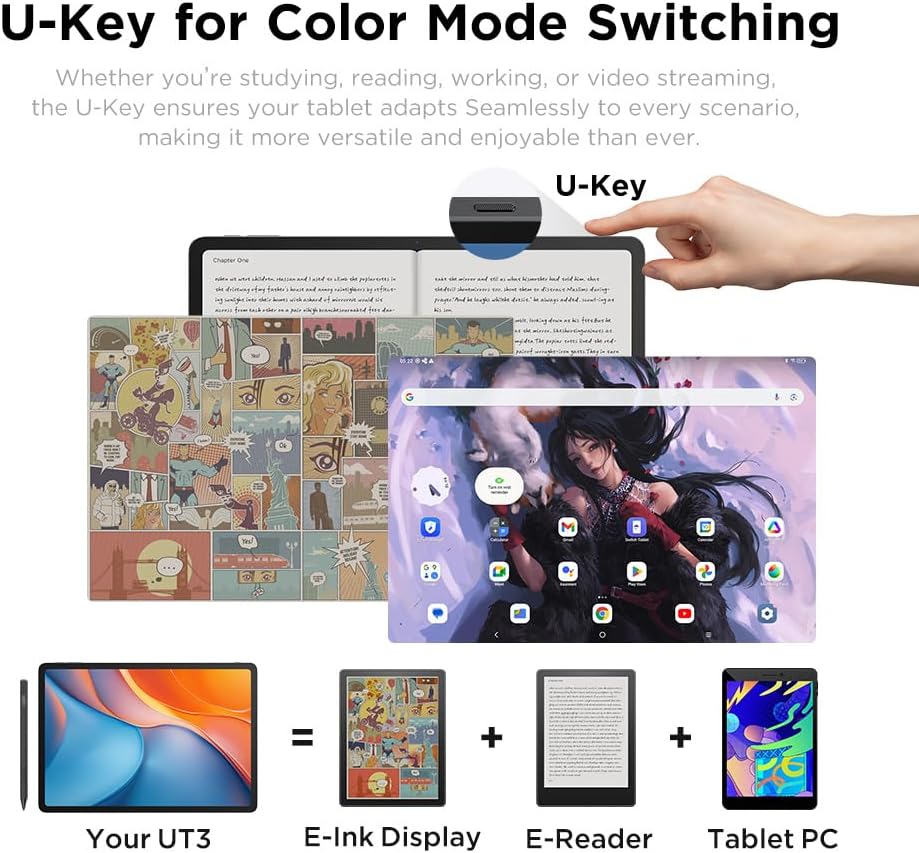 U key for color mode switching: the drawing tablet changes effortlessly between regular/ ink/ color paper modes to meet the diverse needs of your activities, whether completely involved in a book, writing down notes or enjoying vibrant images