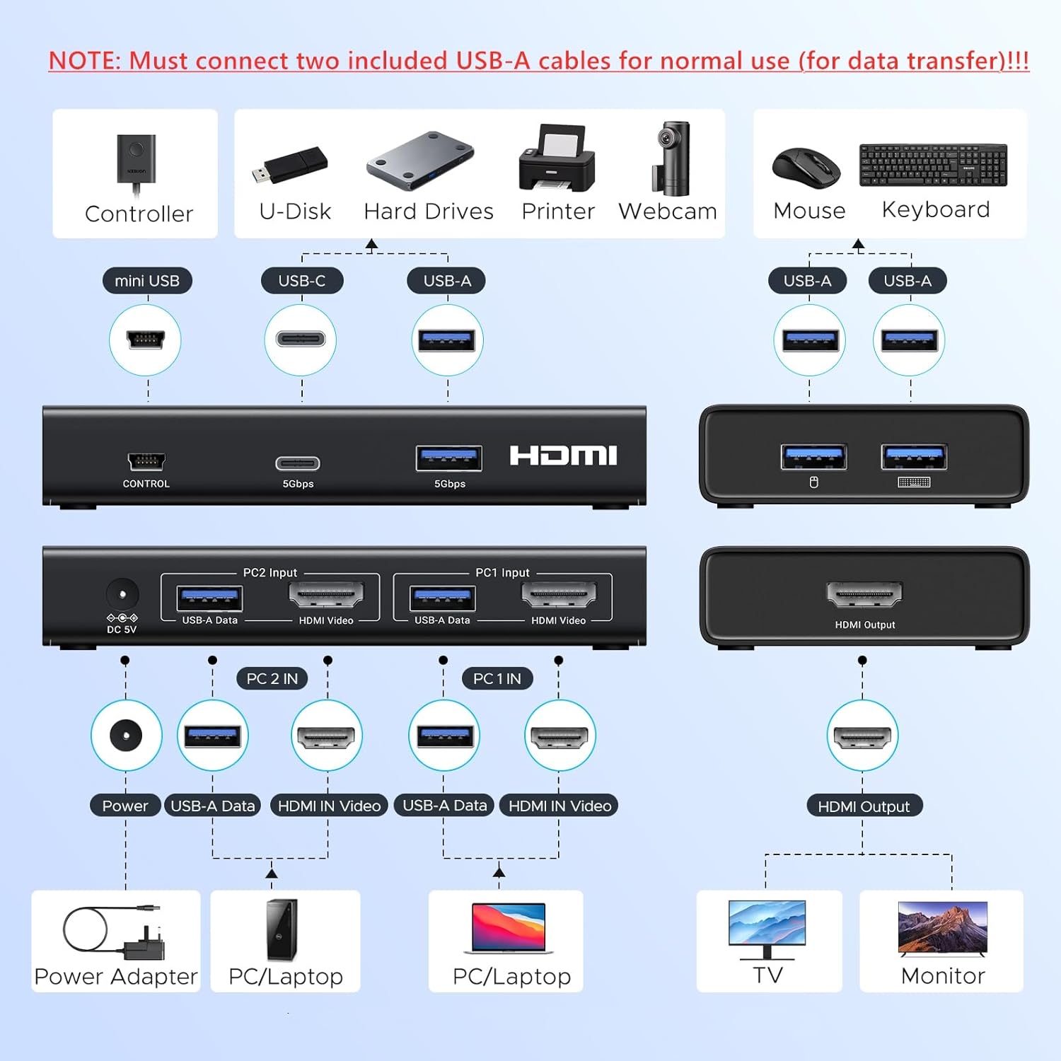 Switch KVM 1 Monitor 2 computers: This HDMI KVM switch can control 2 computers to share 1 monitor and 4 USB 3.0 devices, such as an established keyboard, mouse, hard drives, U and printer disc. It is not only a keyboard mouse switch switch, but also an HDMI switch. You can easily change between two hosts, which maintains your orderly work space and helps maximize productivity