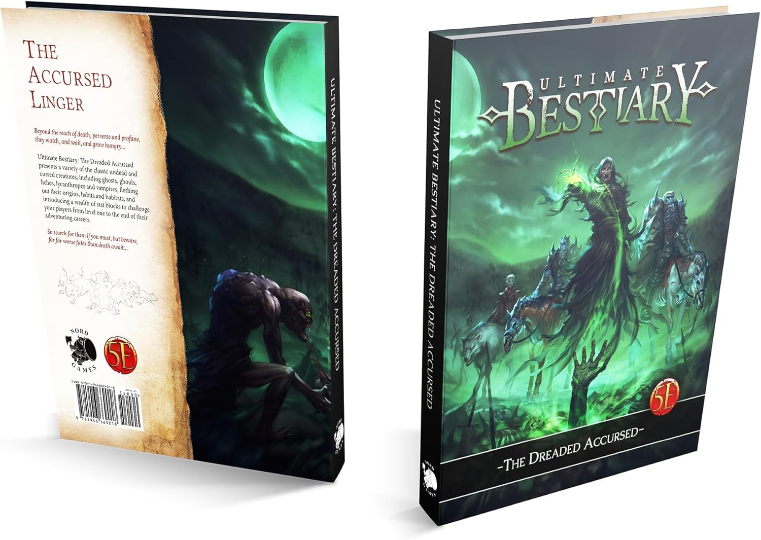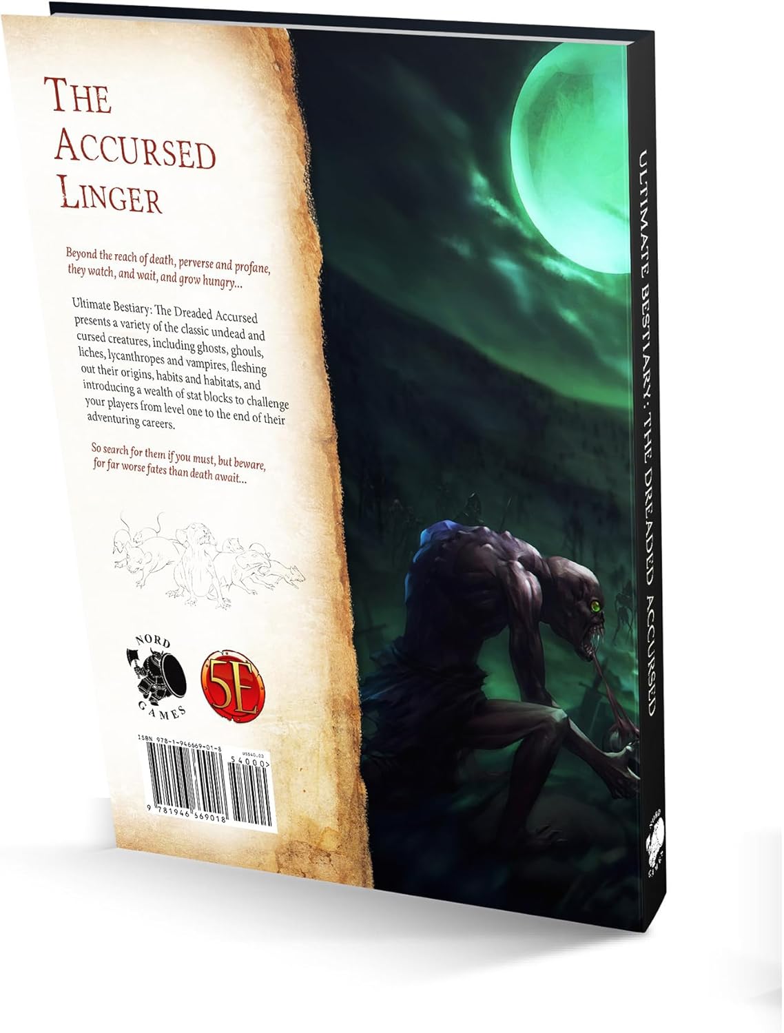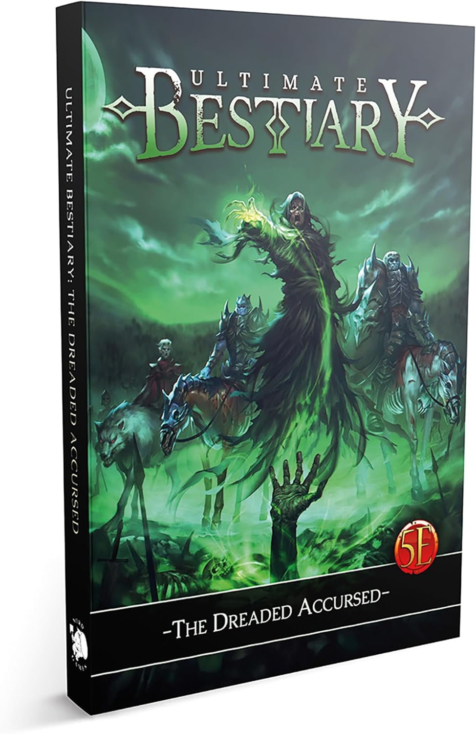 ULTIMATE BESTIARY: THE DREADED ACCURSED (5E) – ROLE PLAYING GAME SOURCEBOOK – Beyond death's reach, wicked and unholy watch, wait, and hunger… Ultimate Bestiary: The Dreaded Accursed introduces a variety of classic undead and cursed creatures, including ghosts, demons, liches, lycanthropes, and vampires, delving into their origins, habits, and habitats, and introducing a wealth of stat blocks to challenge your players from level one to the end of their adventuring careers. So seek them out if you must, but beware, for fates far worse than death await them… Hardcover Roleplaying Game Sourcebook. Full color. 268 pages. Compatible with 5th Edition. Tabletop Roleplaying Game.