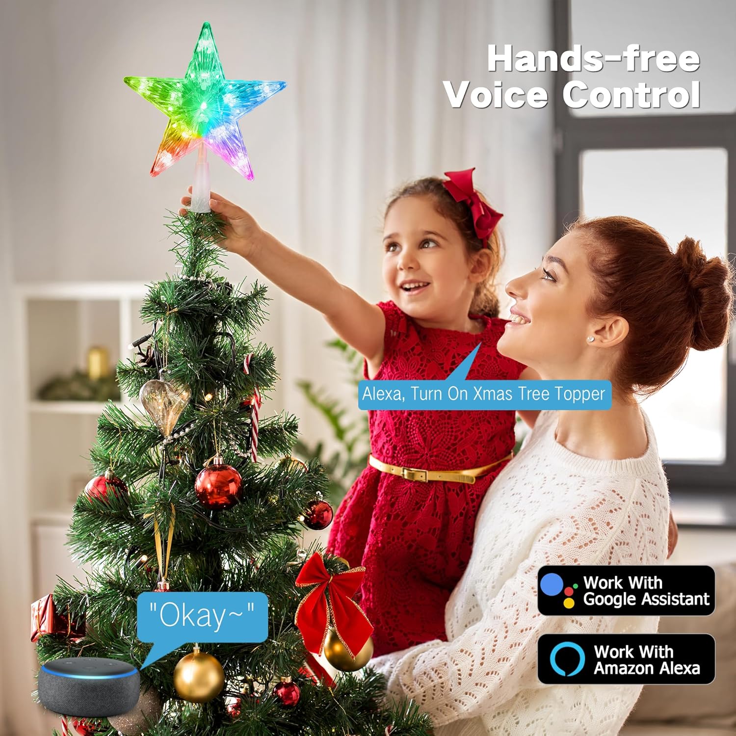 Use Amazon Alexa or the Google assistant to control your intelligent tree topper with only your voice to attenuate and illuminate or even change the colors without ever lifting a finger.