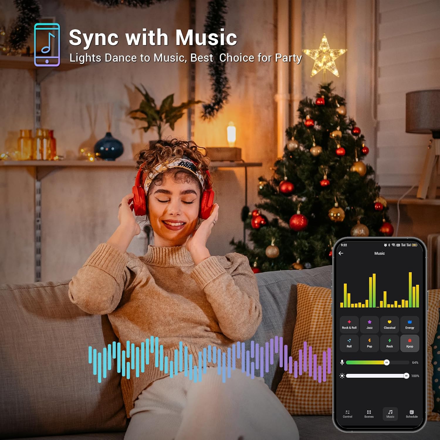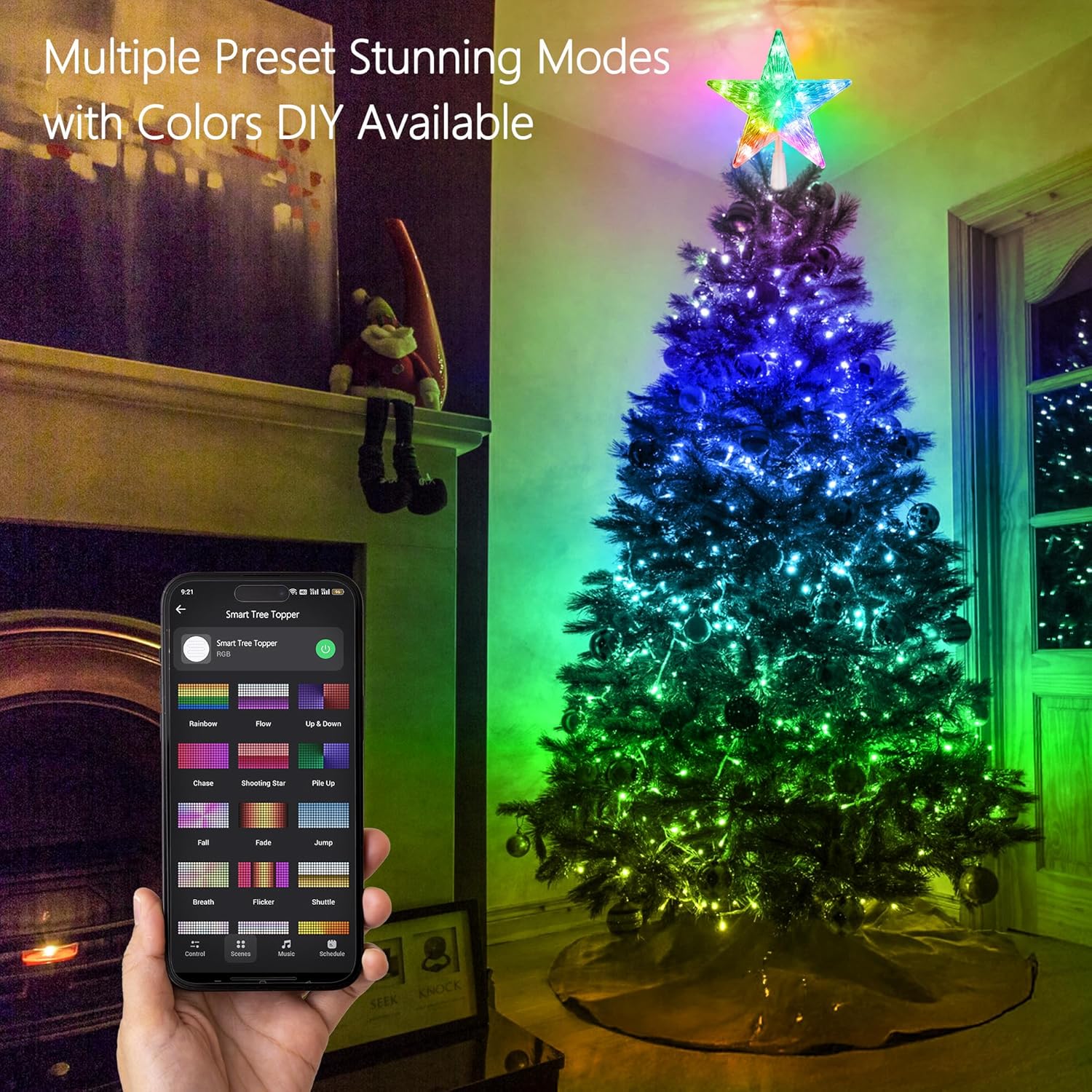 Synchronization with music: Type 6 rhythms incorporated (rock and roll, jazz, classic, roll, energy and spectrum), allow you to dance with your favorite songs accompany with your fantastic intelligent tree topper and smart tree lights.