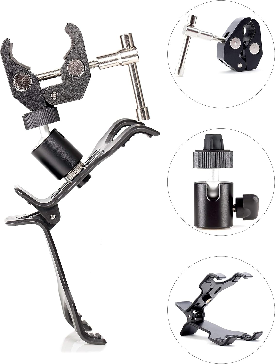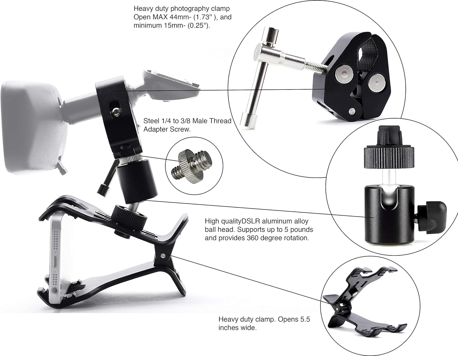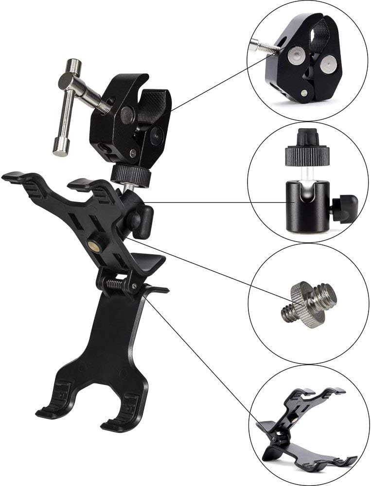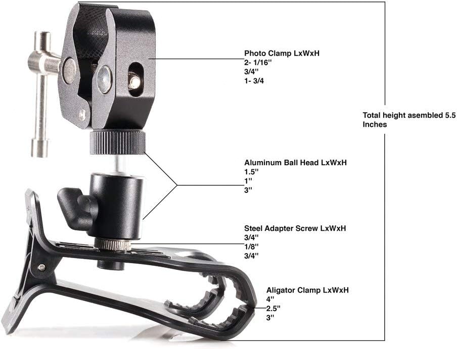 Clamptastick!- Born to provide its users with the most flexible and functional phone mounting solution that is versatile and used in many of life's applications. This kit provides high-quality components using long-lasting camera accessories mainly made of high-quality metal and plastic. The metal crab clamp can adhere to surfaces up to approximately 1.5 inches wide, which means that when you tighten this clamp, it will not fall off over time due to heat or drying. The aluminum ball head is made to support 5 pounds and provides 360-degree viewing while keeping your phone locked in place at any angle. The alligator clip that holds the phone can be detached and used on your desk for a video call or to keep your phone in sight. These components can be used separately to add more functionality to your life. Whether you are a professional driver, executive, college student, videographer or on-the-go photographer, you will find there is an application where this clamp will serve you well and exceed your expectations. Add this clamp to your cart and enjoy a Clamptastick day!