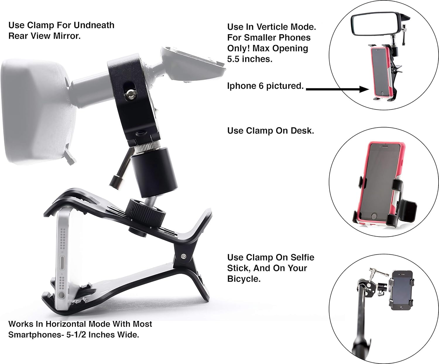 *****(Works in landscape mode on rear view mirror only)***** Clamptastick version 1 is a large, lightweight, strong clamp that holds your phone in one place. Now you can finally let go of your phone in a second with just a quick squeeze.