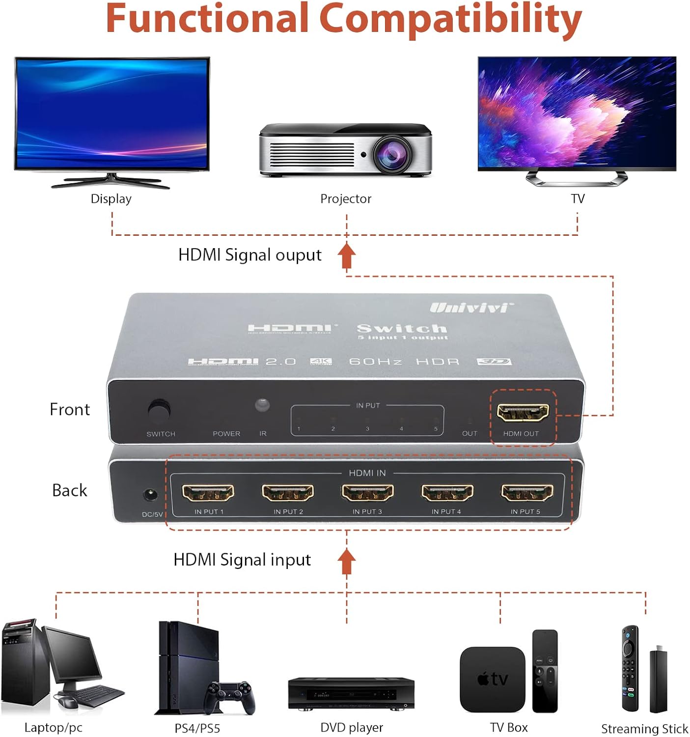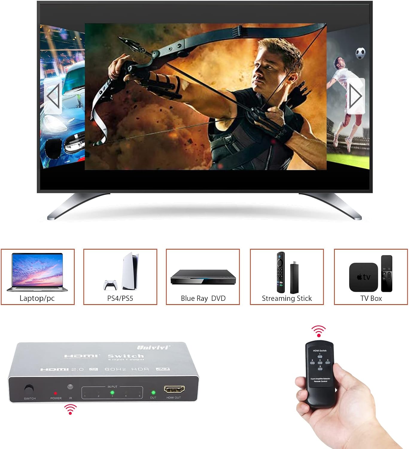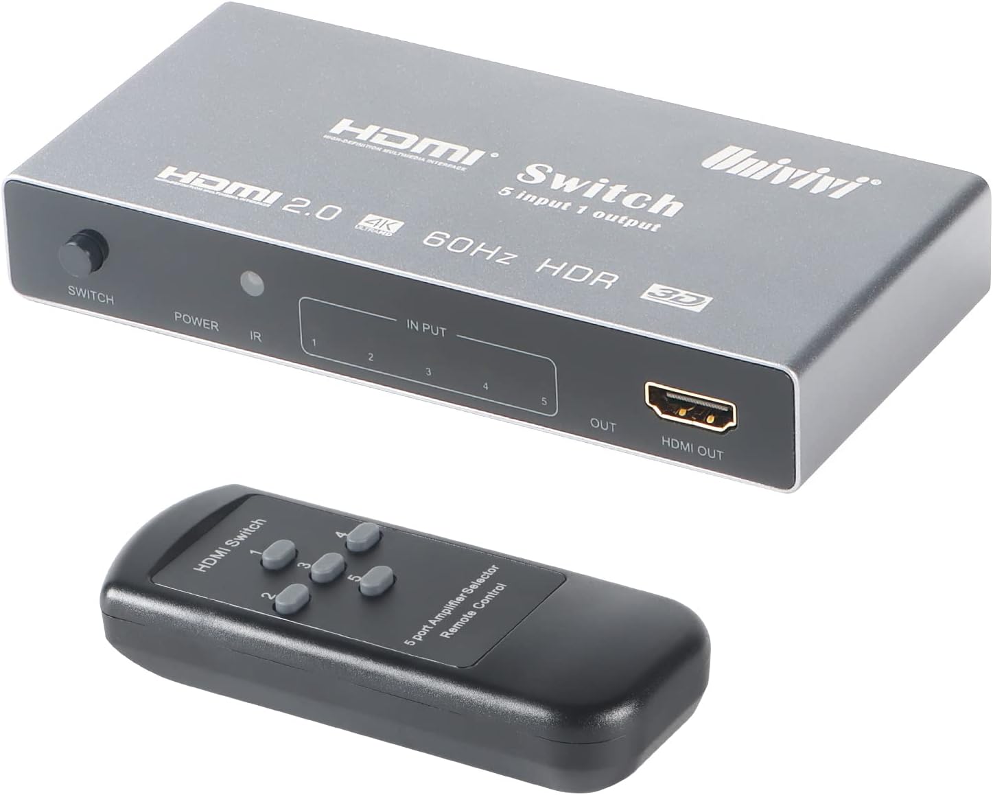 【Smart HDMI Switch】-Univivi HDMI switch box supports connecting up to 5 HDMI sources and easily switches between 5 sources on a single screen. Easily switch 5 HDMI sources to a single HDTV and reduce cable connection clutter on your TV. Metal case, solid and heat dissipated, signal assured. Plug and play, no software required.