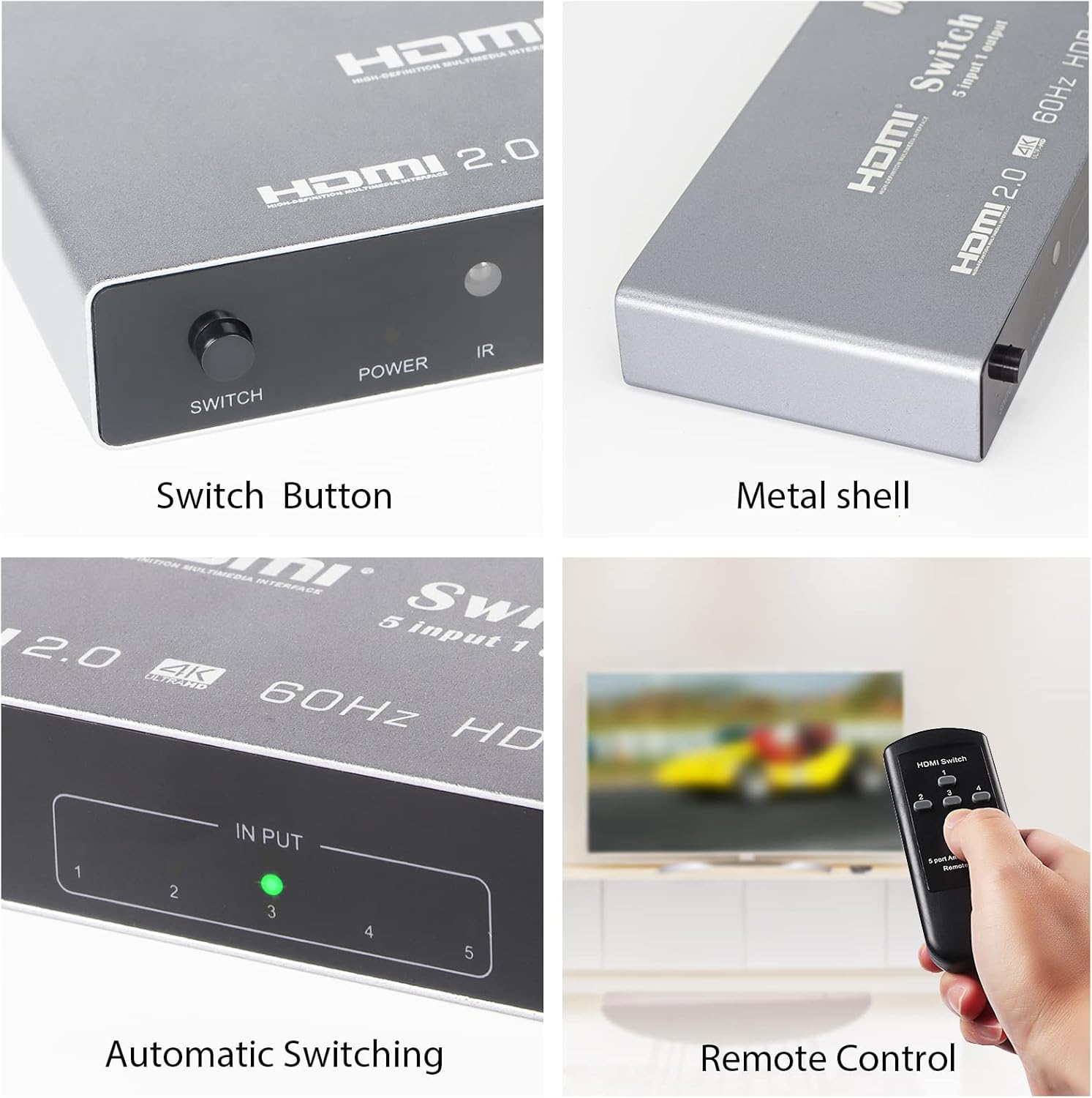 The 4K HDMI Video Switcher easily shares video and audio from 5 different HDMI sources with 1 HDMI display. NO flash or resolution drop. No need to plug and unplug frequently. It is ideal for living room, meeting room, multimedia teaching room, monitoring room, trade show and backyard.