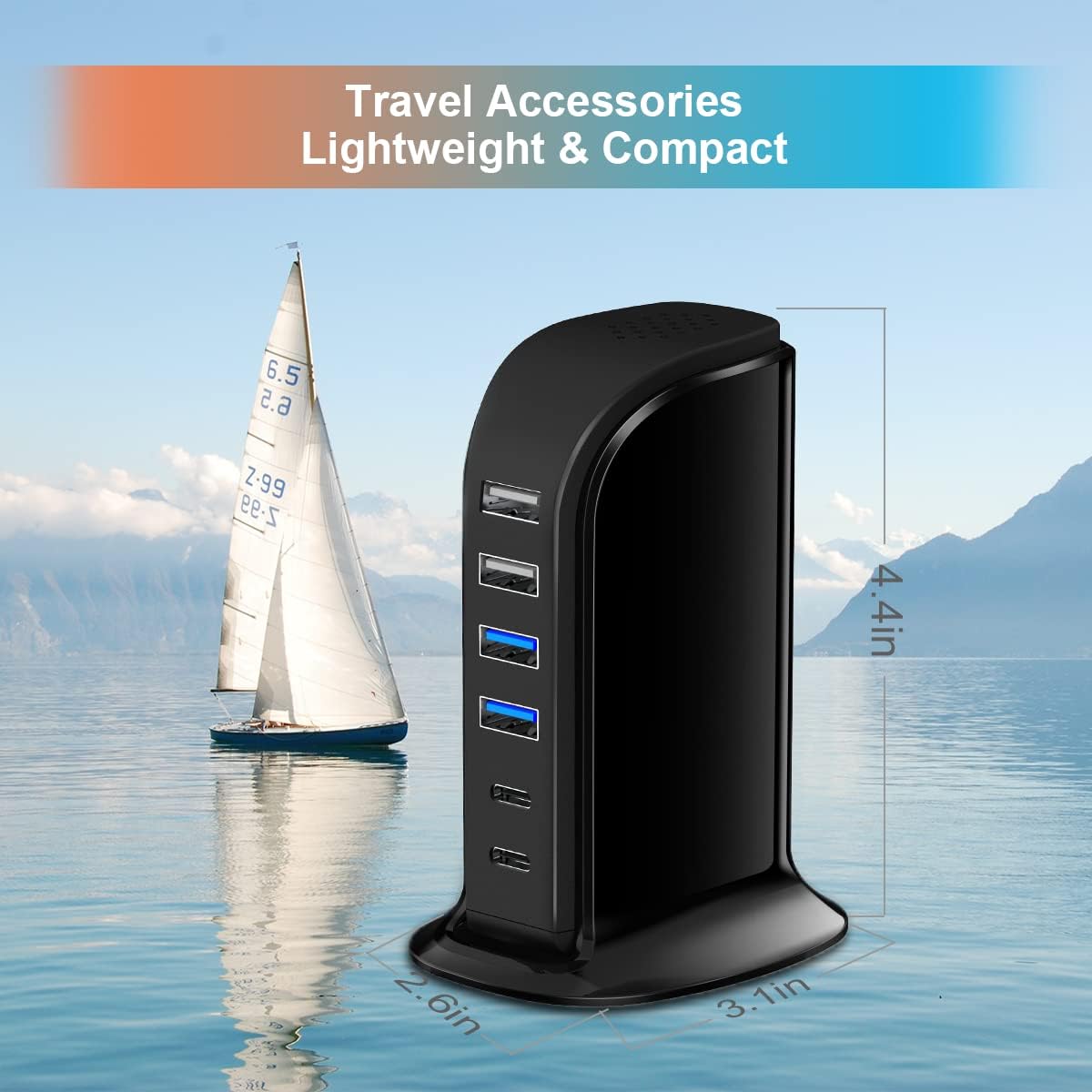 Essential Personal Charging Hub for Cruise Ships – Charging Tower with 4 USB-A Ports and 2 USB-C Ports, Glossy Housing and Small Size – Travel Accessories for Men, Women, and Teens.