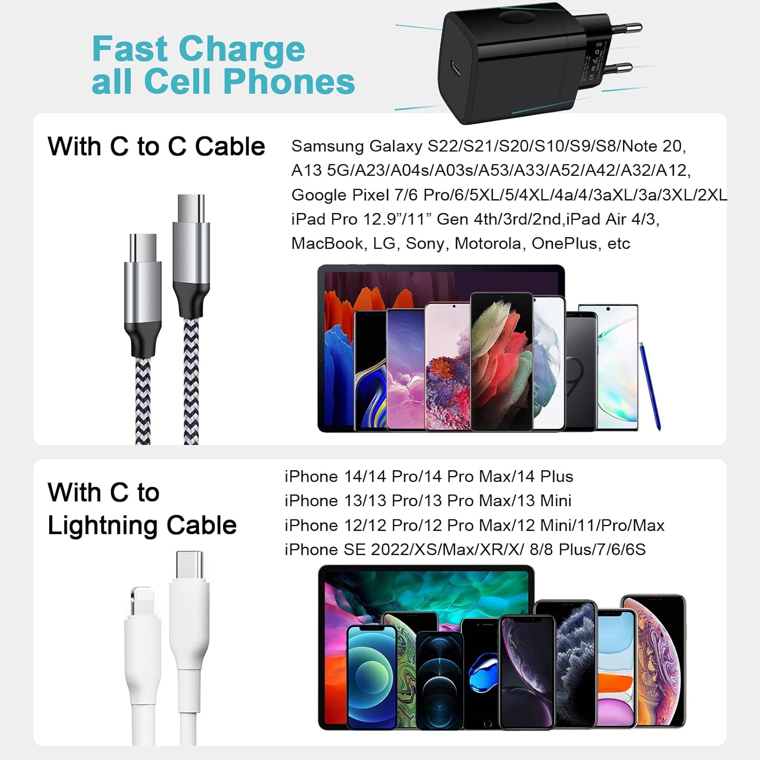 Universal Compatibility: This USB C charger is compatible with iPhone 16 Pro Max/16 Pro/16 Plus/16, iPhone 15/15 Pro/15 Pro Max/15 Plus, 14 Pro Max/14/14 Pro/14 Plus, iPhone. 13/13 Pro/13 Pro Max/13 Mini, iPhone 12/11/SE/XR/XS/XS Max/X/8, iPad Pro 12.9/11/iPad Air 4/3/iPad Mini, AirPods; Samsung Galaxy S24/S23/S22/S21/S20/S10/S10e/S9,A16 5G A15 5G A14 A54 A55 A35 A25 A13 A23/A03S/A25/A04s/A32/A53/A34/A24,Special Z-Fold,Fold at Z 6 5 4 3,Z Flip 6 5 4 3, Note 10/20/9; Google Pixel 9 Pro XL,9 Pro Fold,9 Pro,9,8a 8 Pro 8 7a 7 6 Pro/6/6a/5XL/5/4a 5G/4 3a 3a 3 2 XL; LG G8/G7/V50/V40/V35/V60, all USB-C plugs.