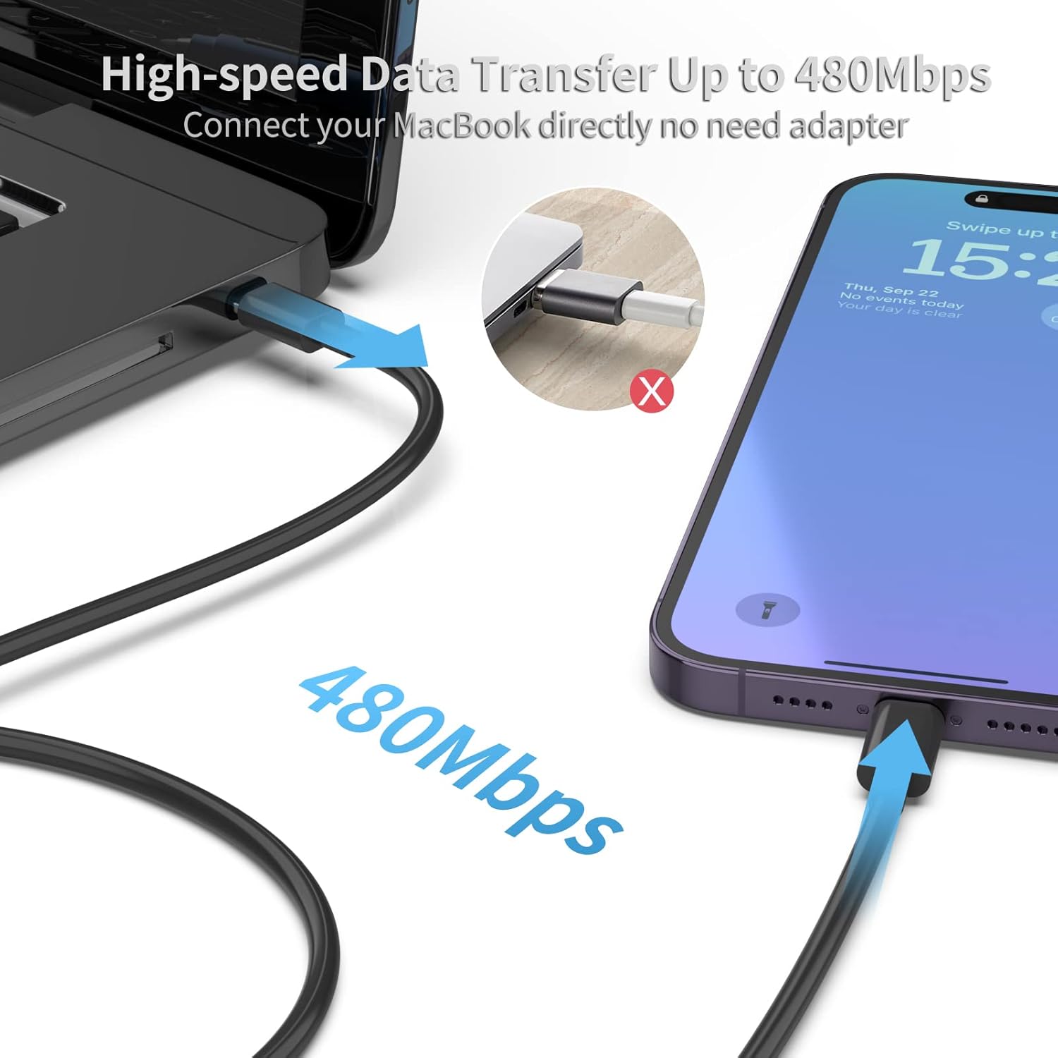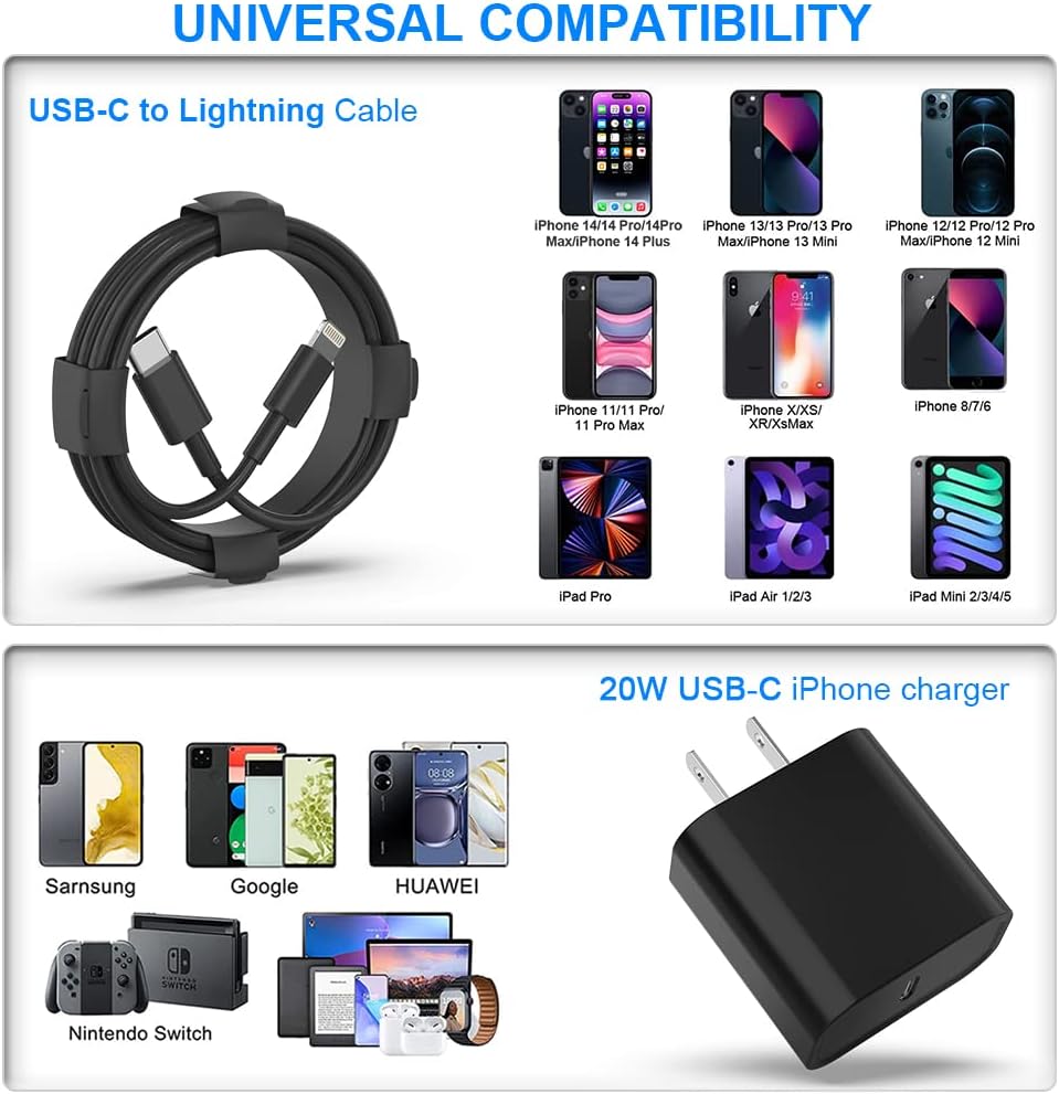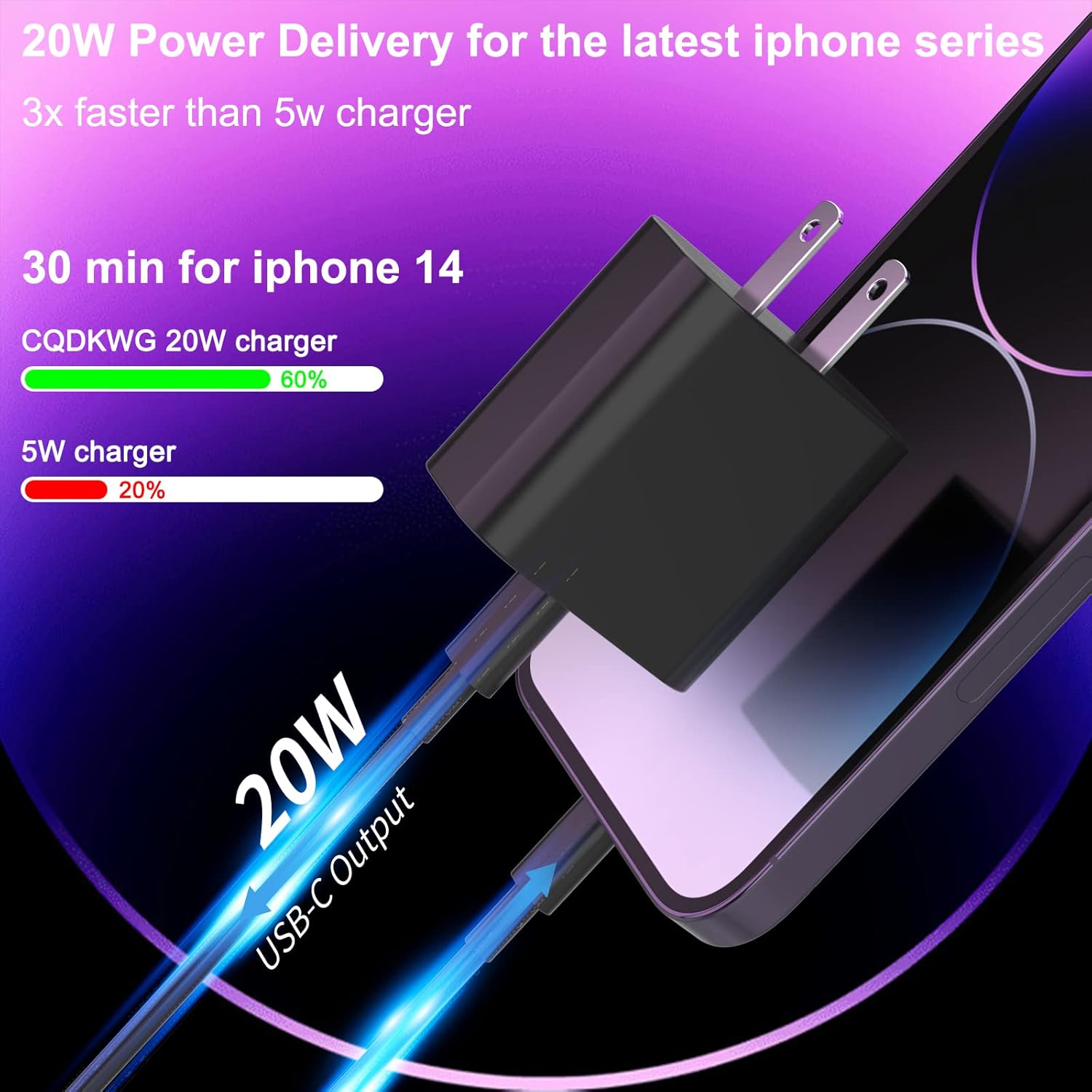 【20W USB C Fast Charging & Sync】Charge iPhone 14 13 12 from 0% to 60% in just 30 minutes. PD 3.0 fast charging USB C charger with 6ft Type C to Lightning cable saves you over 1 hour compared to the original 5W charger. It also supports fast data transfer speeds up to 480Mbps. Enjoy faster charging and data transfer.