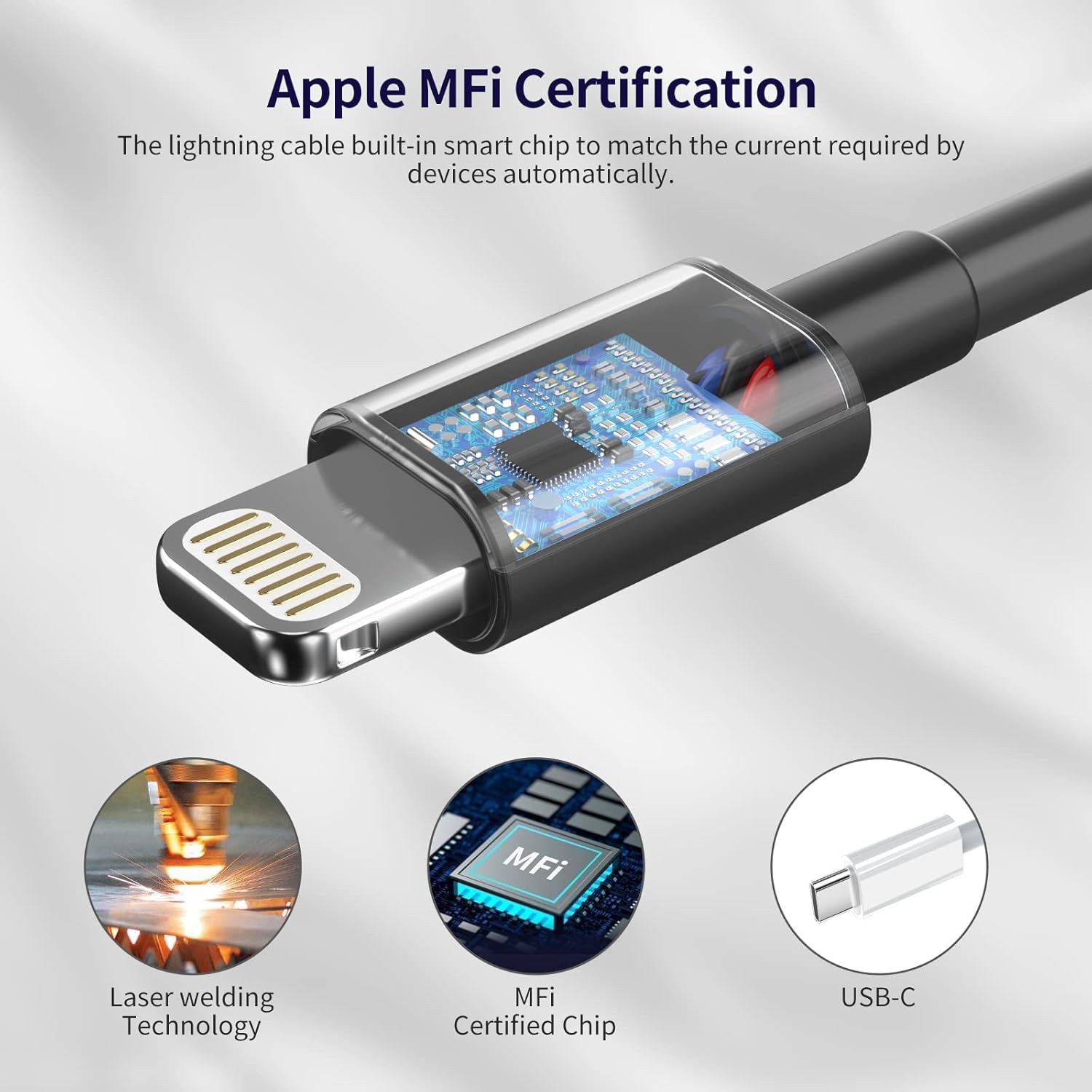 【Super Safe & Fast Charging】The iPhone USB-C Lightning charger cable has a multi-powerful safety system that ensures complete protection for your Lightning devices, preventing over-voltage, over-charging, over-heating, etc. The 6ft tangle-free length is convenient to use while charging and syncing at home, office, or traveling.