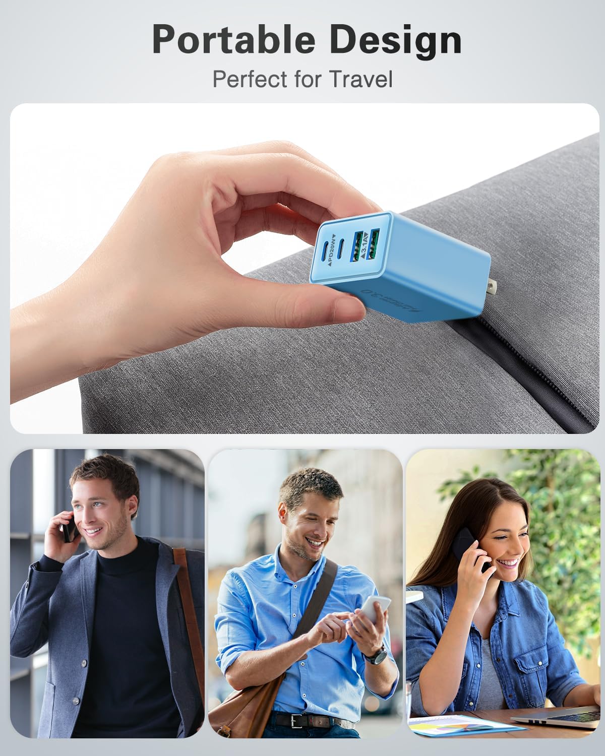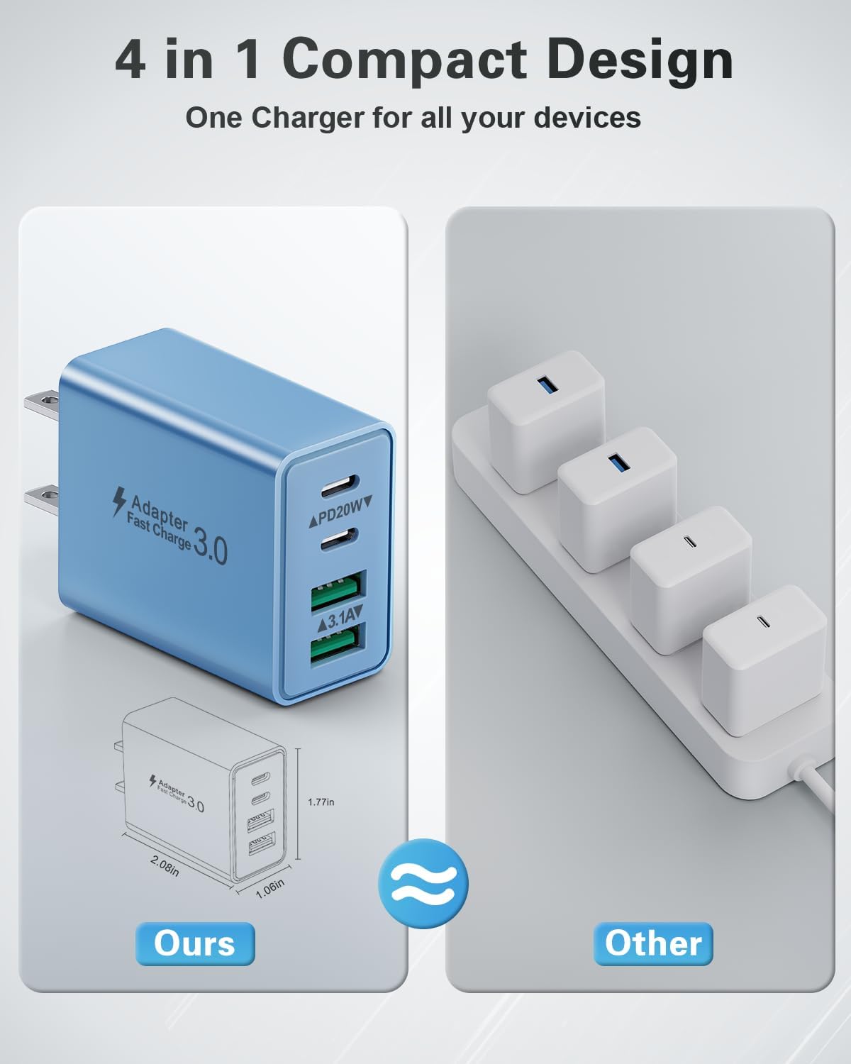 The 4 port loader has two USB-C ports and two USB-A ports, load your phone, tablet and headphones simultaneously to minimize the waiting time. It also saves a lot of space instead of occupying 4 wallpot ports.