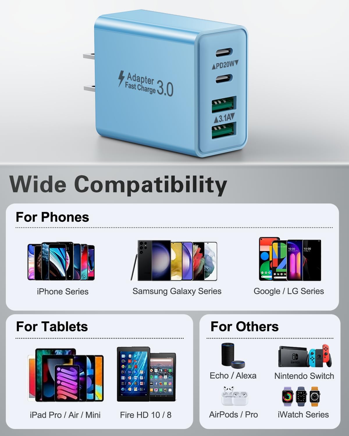 Broad compatibility: Koemgi fast charging block with USB-C port and USB-A DUAL port for iPhone 15/15 Plus/15 Pro/15 Pro max/iPhone 14/14 Plus/14 Pro/14 Pro Max/13/13/13 . Mini/13 pro/13 pro max/12/12 mini/12 pro/12 pro max/11/11 pro/pro max/xs max/xs/xr/x/8/8 plus/7/7 plus/6 /6S/SE/, iPad Pro/Air/Mini, Airpods Pro, Samsung Galaxy S24/S23/S22/S21/S21+/S21 Ultra/S20/S20 Ultra/S20 Fe, Note 10, Note 20/20 Ultra/S10, Galaxy Z Fold 3, A53, A71, Tab S7/S7+/S8/S8+, LG, Google Pixel