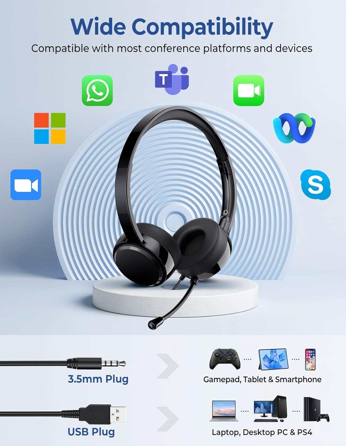Plug and Play, Easy to Use: Our computer headphones with microphone are designed with a unique 2-in-1 design (USB plug and 3.5mm jack), making them plug-and-play without the need to download software or install drivers; Simply plug the PC headset into the USB or 3.5mm port of your computer or other device and start using it immediately; Plus, the 7.9-foot long cord lets you move around more, which is helpful during meetings, especially if you're presenting.