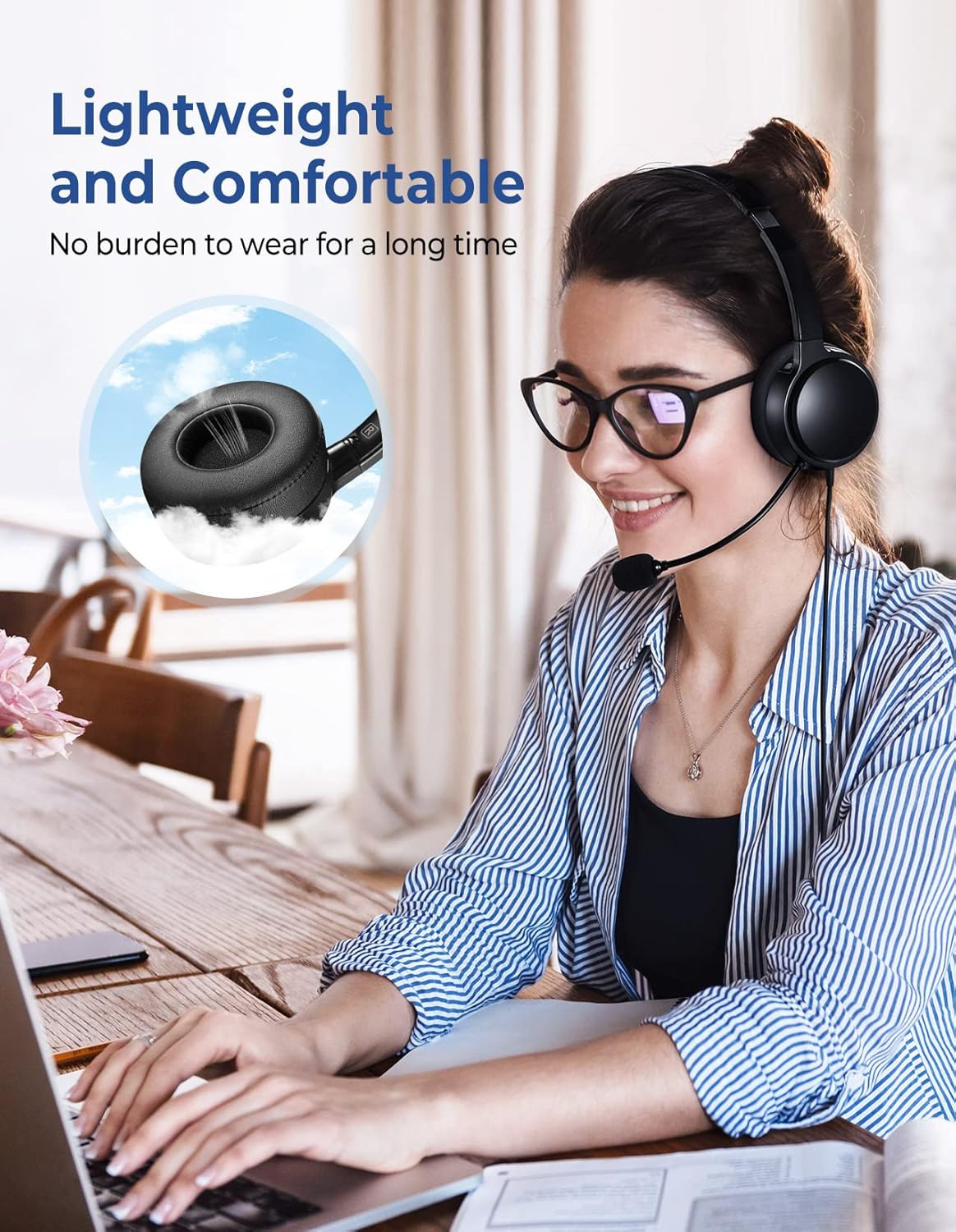 Comfortable to wear all day: For those who need to talk for a long time, this USB headset with microphone for PC is a good choice; Lightweight design and soft ear pads without putting too much pressure on your head and ears; Adjustable shock-absorbing headband and 90-degree rotating earmuffs, suitable for various head shapes; Additionally, our over-ear headphones have excellent breathability, so you won't feel stuffy or uncomfortable.