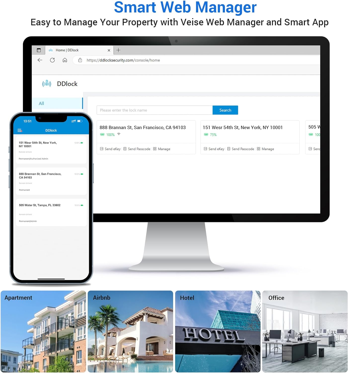 Keyless Access: Enjoy keyless entry via app control, fingerprint, passcode, key fob and electronic keys. Includes two physical keys. Suitable for various situations and user groups