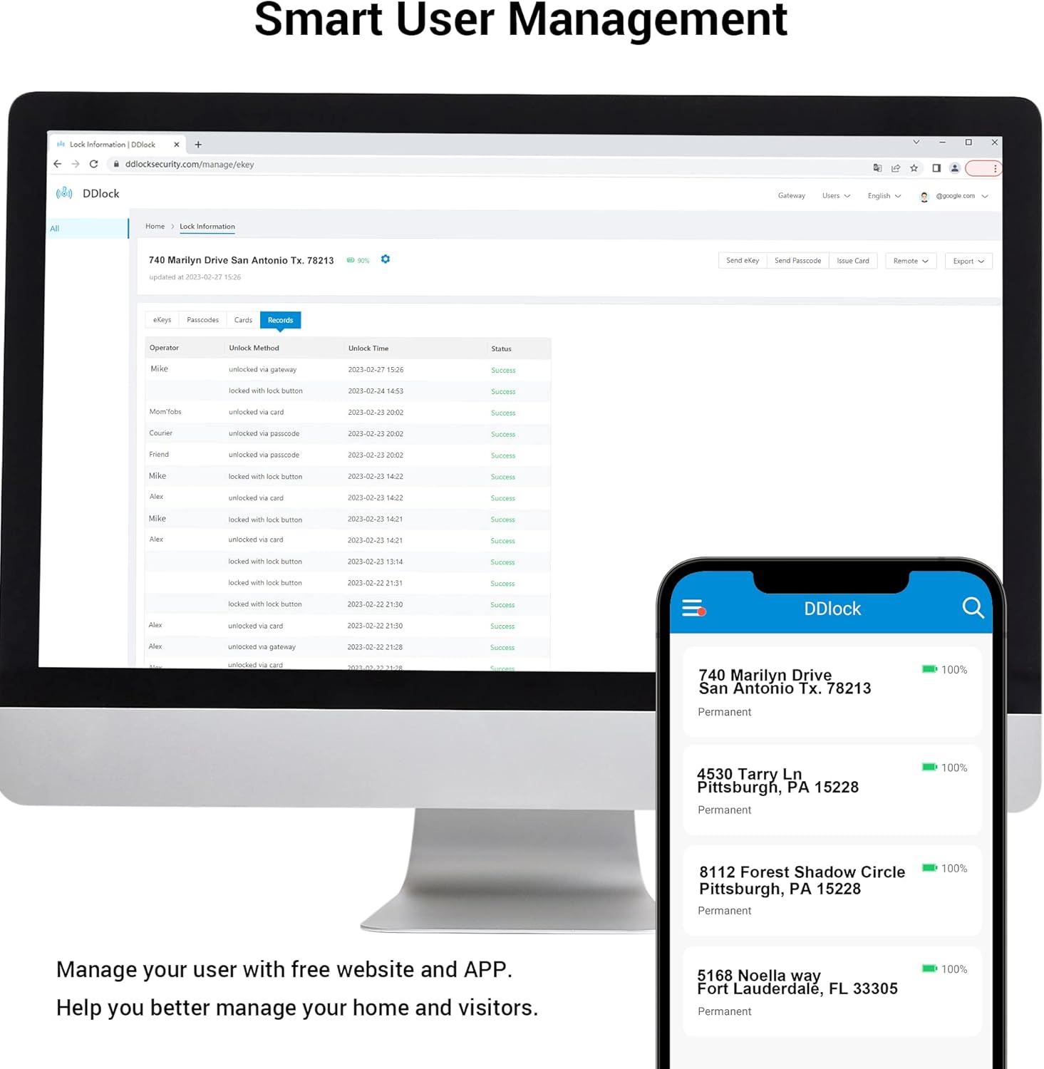 APP Control & Ekeys: Smart locks can realize APP control, set passwords, manage access rights and view access records, and can also authorize your family members, guests or tenants to use the APP through eKey.