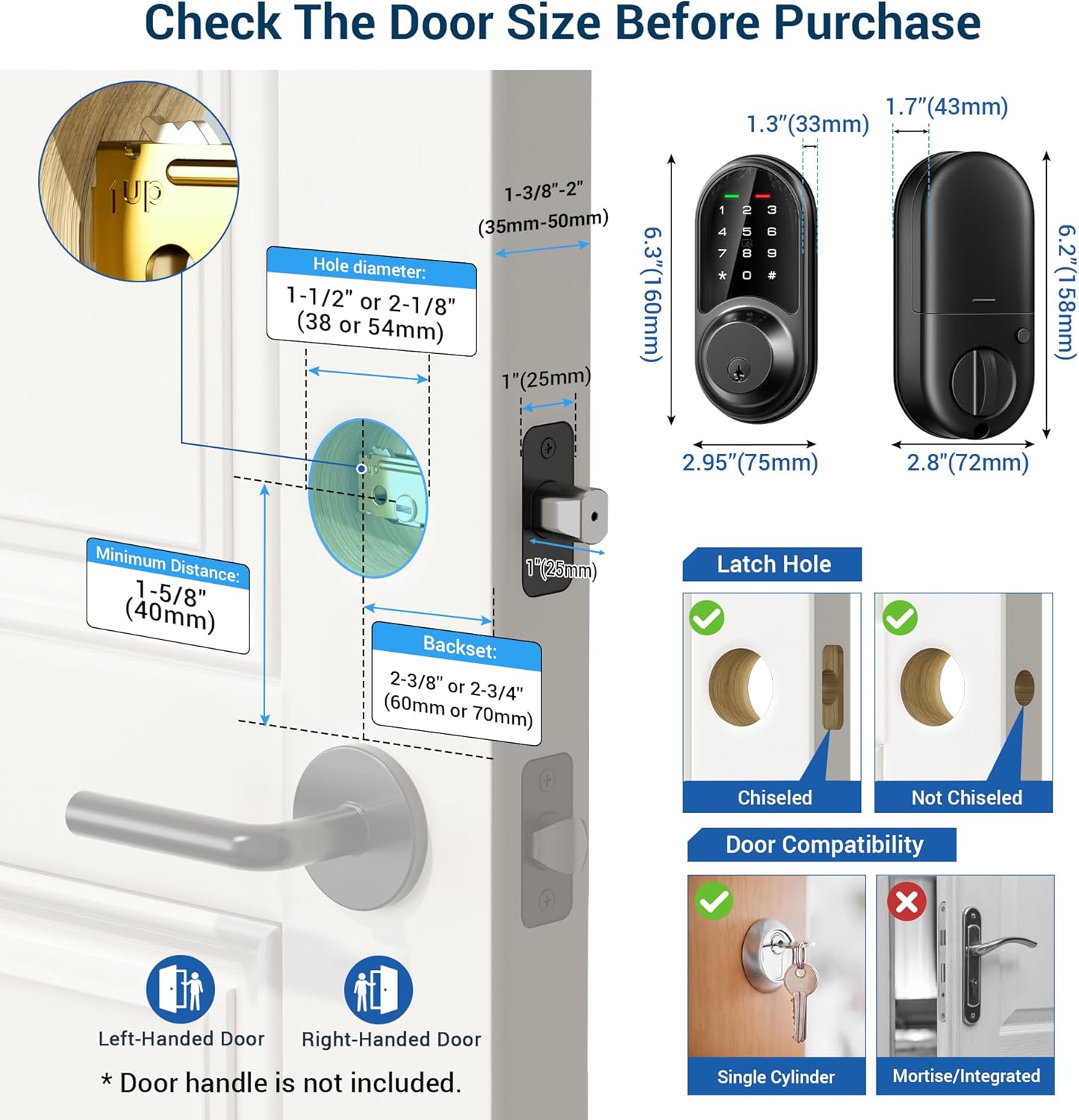 Veise smart lock fits most standard US doors for both right and left handed users. It is easy to install with just a screwdriver. Veise offers at least 1 year warranty and lifetime online phone support from Monday to Friday from 9am to 5pm PDT and 24/7 email after-sale service.