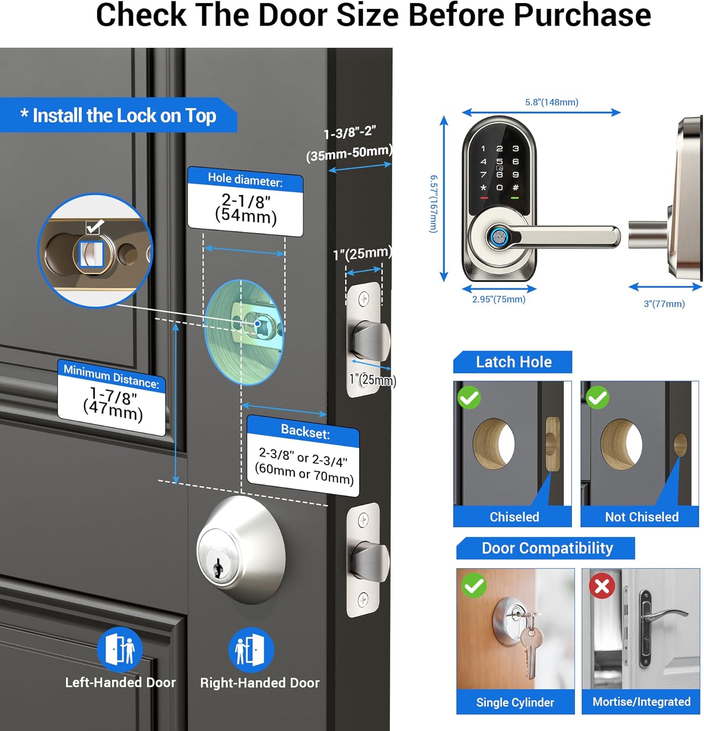Veise Smart Lock adapts to most standard and right doors. Easy to install without drilling.