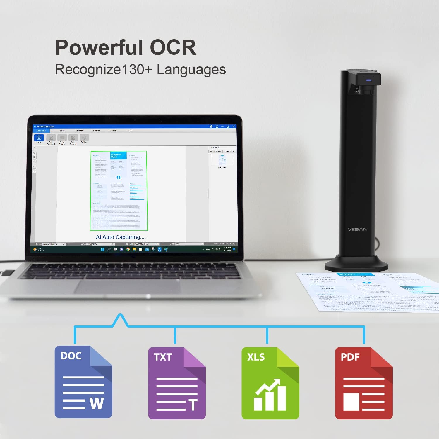 【Powered by Powerful Scanning Software】With VIISAN OfficeCam scanning software, you can automatically flatten curved pages and erase finger images, purify the background and automatically divide them into two pages. And it can take snapshots, recognize barcodes, and scan documents or books into JPEG files and convert them to searchable PDF or editable Word, Excel, and text formats with its OCR engine built into Windows or Mac OS.