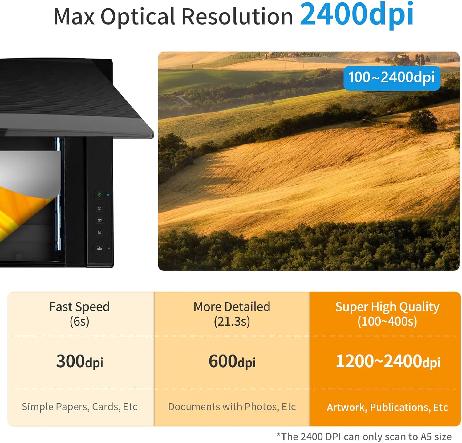 ⭐ A3 flatbed scanner offers the fastest scanning speed of 4 seconds (200dpi, A3 size colour). It also provides a maximum optical resolution of 2400 x 2400dpi which offers a 48-bit colour depth. Users can get a maximum effective image of 196,000,000 pixels. ※ Note: 2400dpi scanning on Windows ViiScan software can only scan to A5 size.