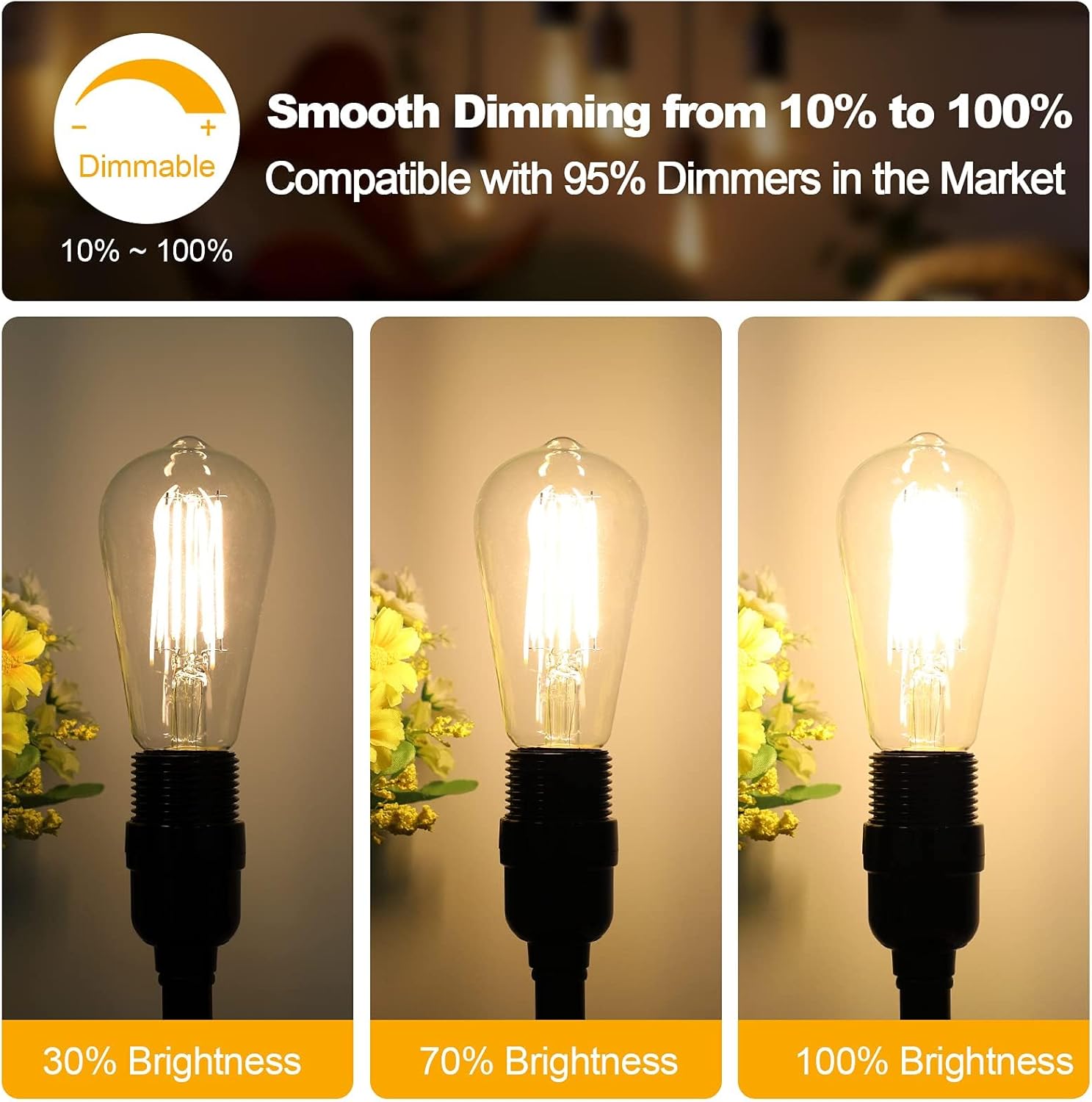 Upgraded Dimmable Feature: Designed with smooth dimming capability, our vintage LED Edison bulbs offer brightness levels from 10% to 100%, allowing you to create the right amount of lighting for different occasions. They are compatible with most dimmer switches on the US market. Recommended dimmer models are listed below in the product description for reference.