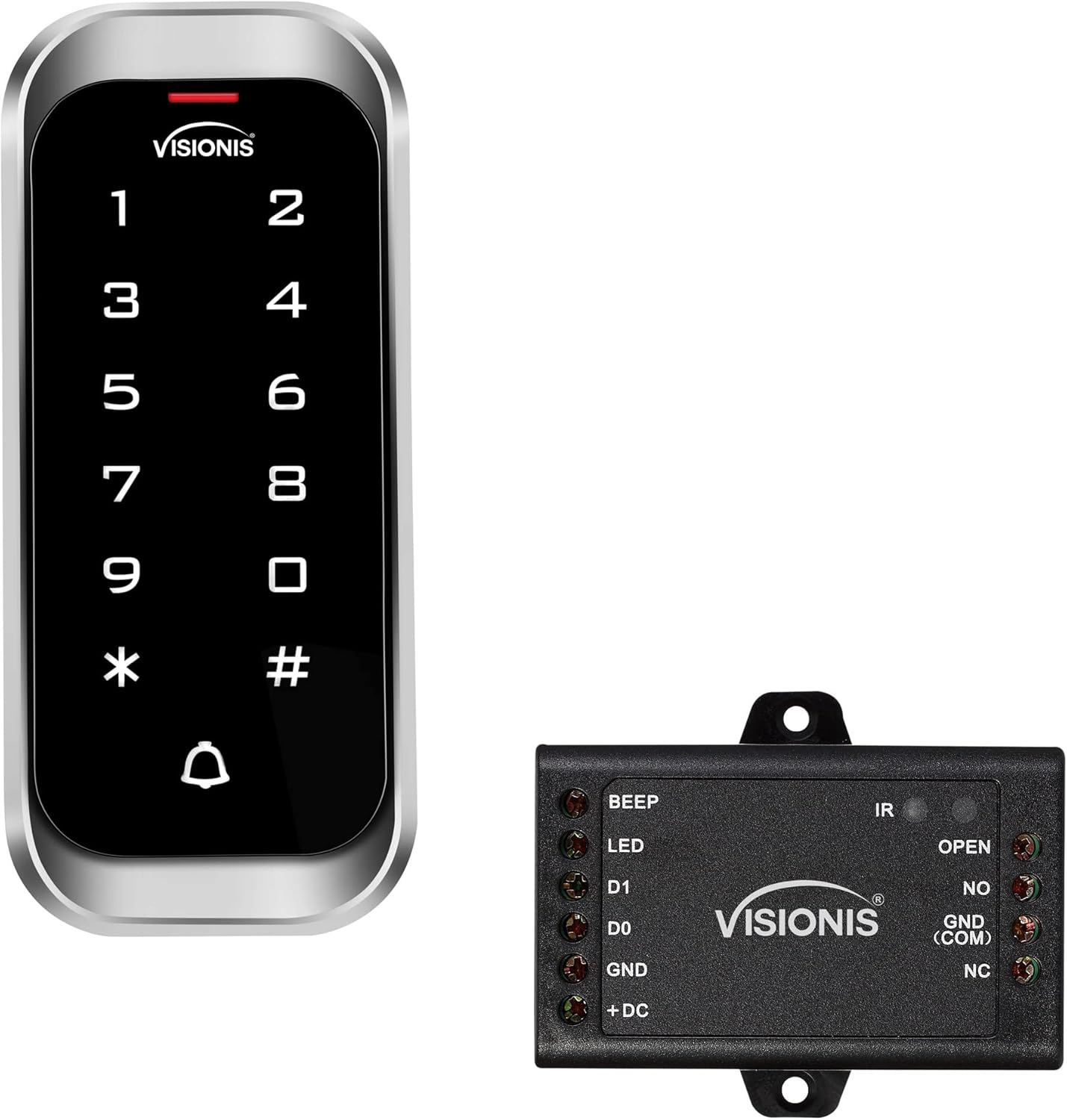 (1) VIS-3003: Indoor/Outdoor Access Control, Vandal-proof Metal Digital Touch Keypad + Standalone Reader with Mini Controller, Wiegand 26, Slim Design, No Software, EM Cards, 1000 Users, (1) VIS-MINI-CNTRL: 1 Door Controller for Access Control Systems without Software. Up to 1000 Users