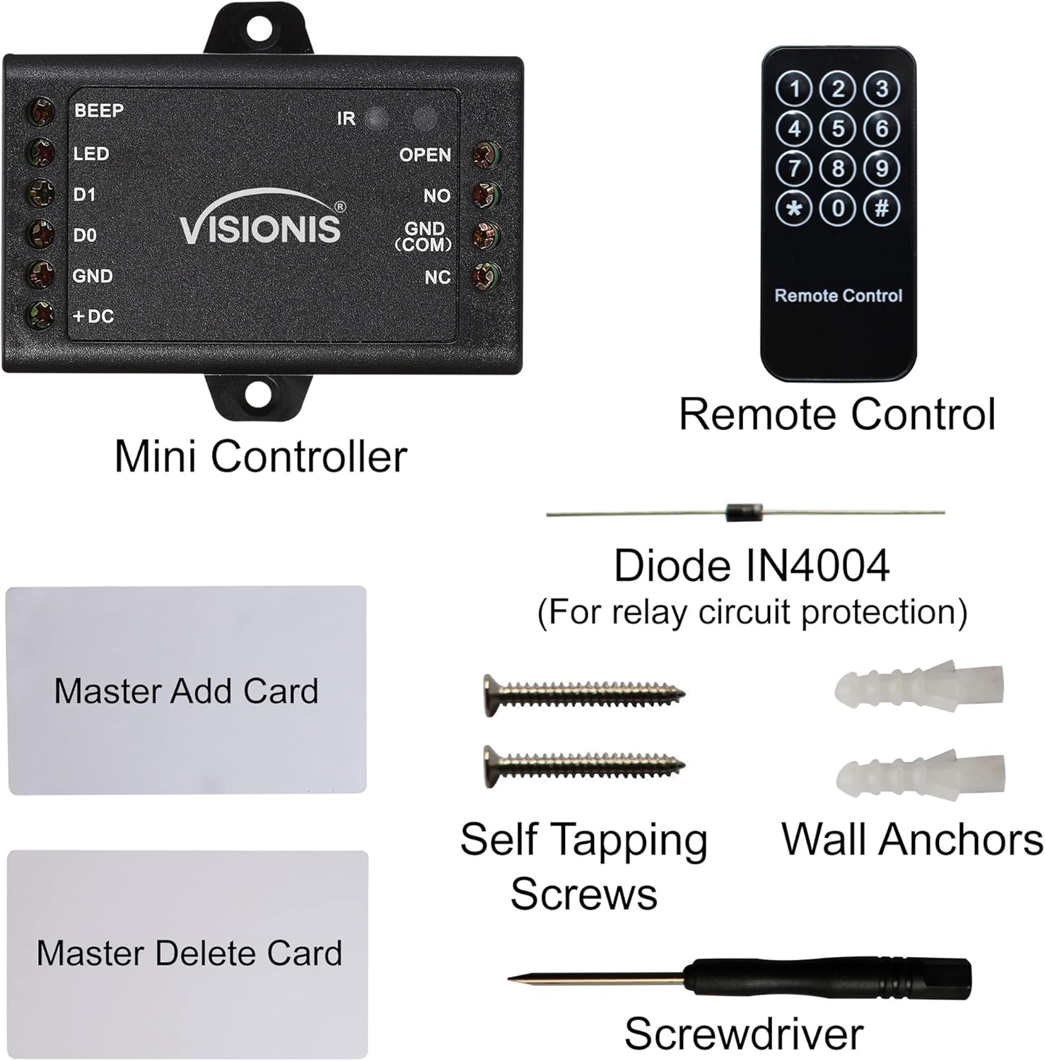 This keypad comes with the VIS-MINI-CNTRL. This device is a single-door mini control panel that can work with any 26- to 37-bit Wiegand output reader. It uses an Atmel microcontroller to ensure stable performance and is equipped with an infrared remote control for easy operation. The VIS-MINI-CNTRL supports 1000 users.