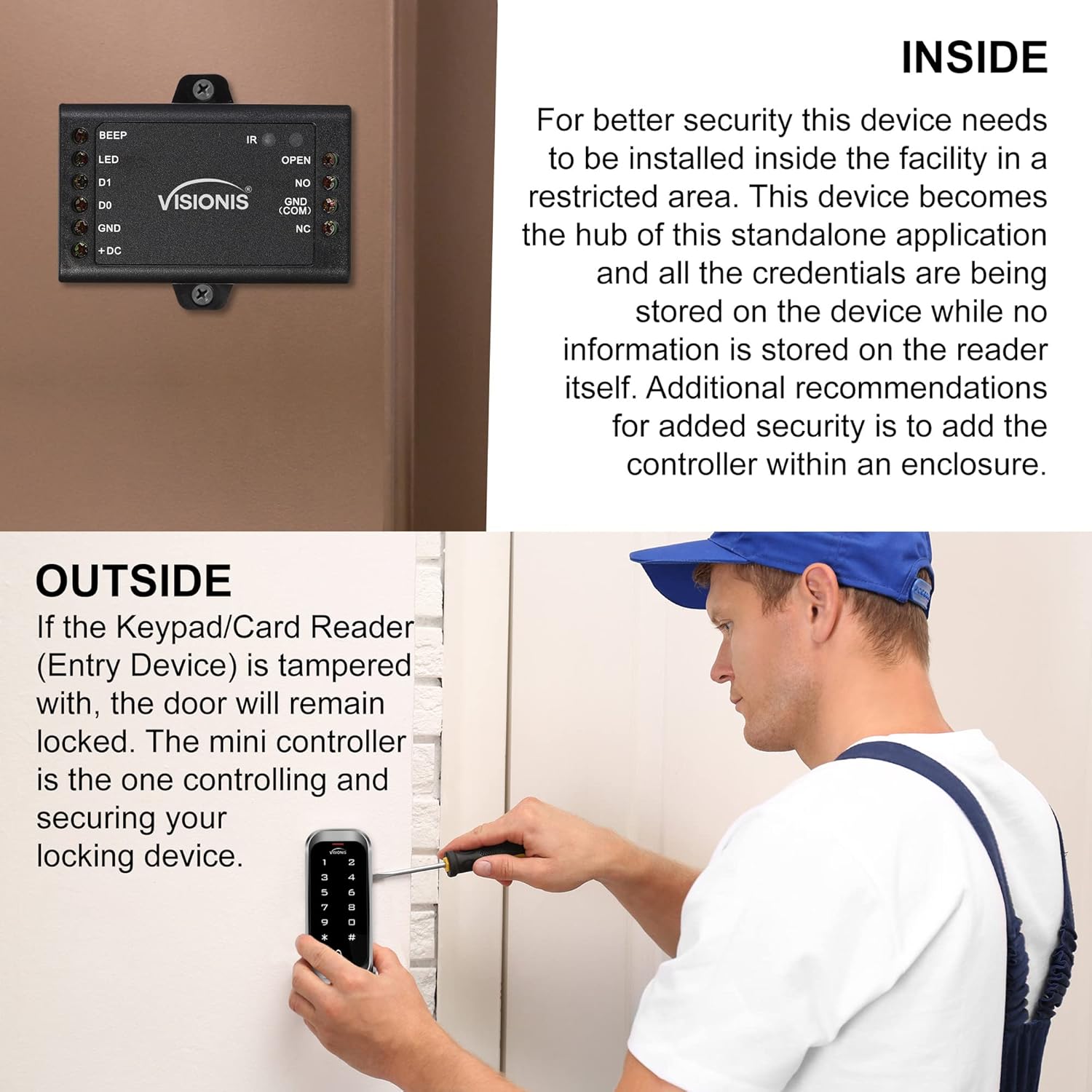 The VIS-MINI-CNTRL offers a more secure option to provide additional security to all types of standalone access control products.