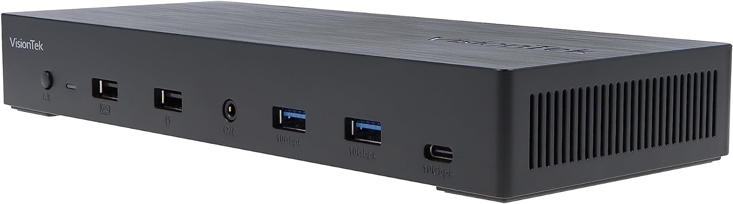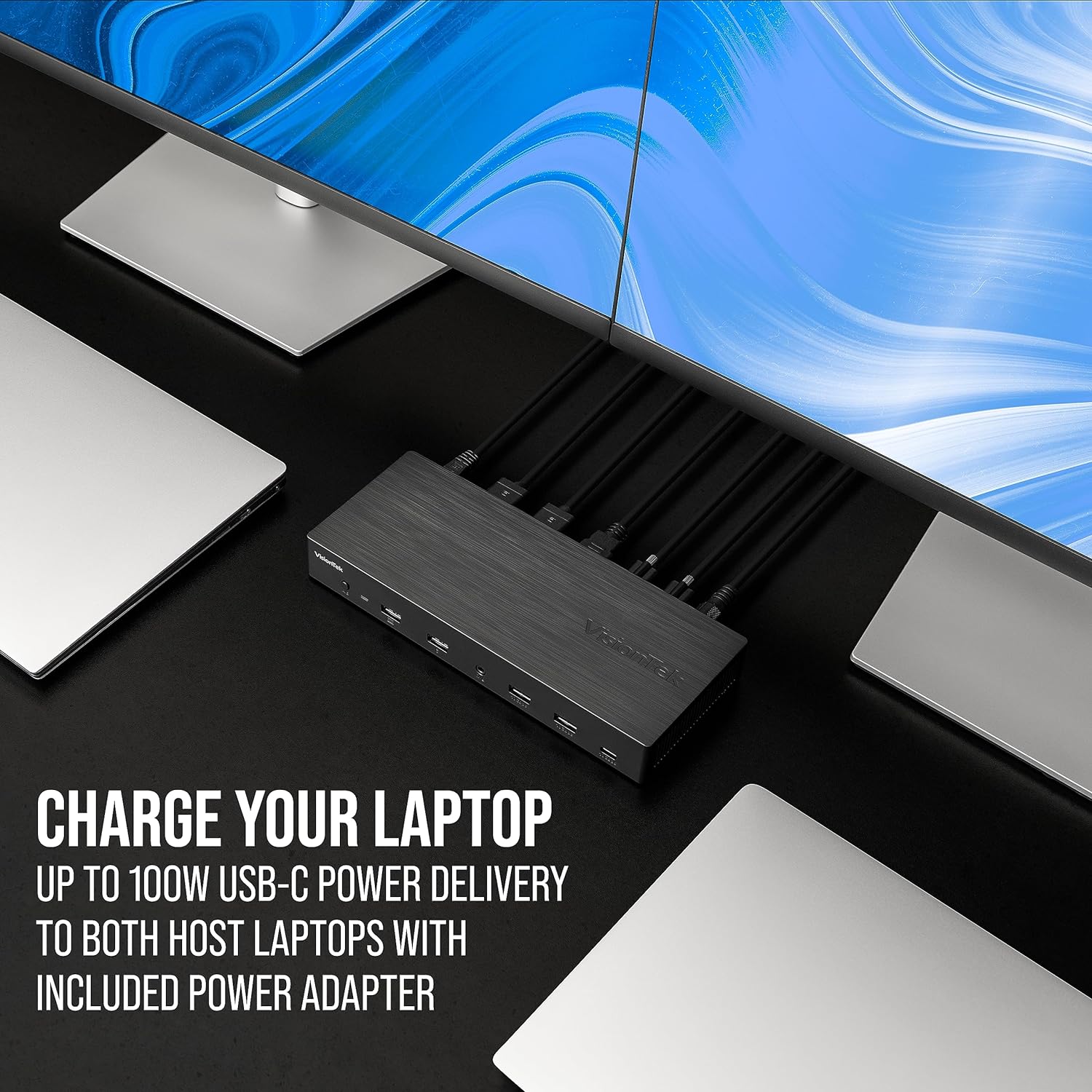 The VisionTek VT4950 USB-C KVM Docking Station lets you easily connect two Windows, Mac, or Chromebook laptops to up to three 4K displays, accessories, and peripherals via a single USB-C connection on each system while providing up to 100W of power delivery to each system. Quickly switch keyboard, mouse, and monitors using the quick-switch button on the front of the docking station or with a hotkey for seamless control of 2 systems simultaneously. Seamlessly transfer files between host systems with the included software whether you’re moving data from a Chromebook, MacBook, or PC. Supported display outputs: Single display support: DisplayPort: Resolutions up to 4096 x 2160 at 60 Hz (4K) HDMI: Resolutions up to 4096 x 2160 at 60 Hz (4K)* Dual display support: DisplayPort: Resolutions up to 4096 x 2160 at 60 Hz (4K) HDMI: Resolutions up to 4096 x 2160 at 60 Hz (4K)* Triple display support: DisplayPort: Resolutions up to 4096 x 2160 at 60 Hz (4K) HDMI: Resolutions up to 4096 x 2160 at 60 Hz (4K)* *Host system must support USB-C DP Alternate Mode to output video from HDMI. Host system must support USB-C DP Alternate Mode and DisplayPort 1.4 for HDMI 4K@60Hz.