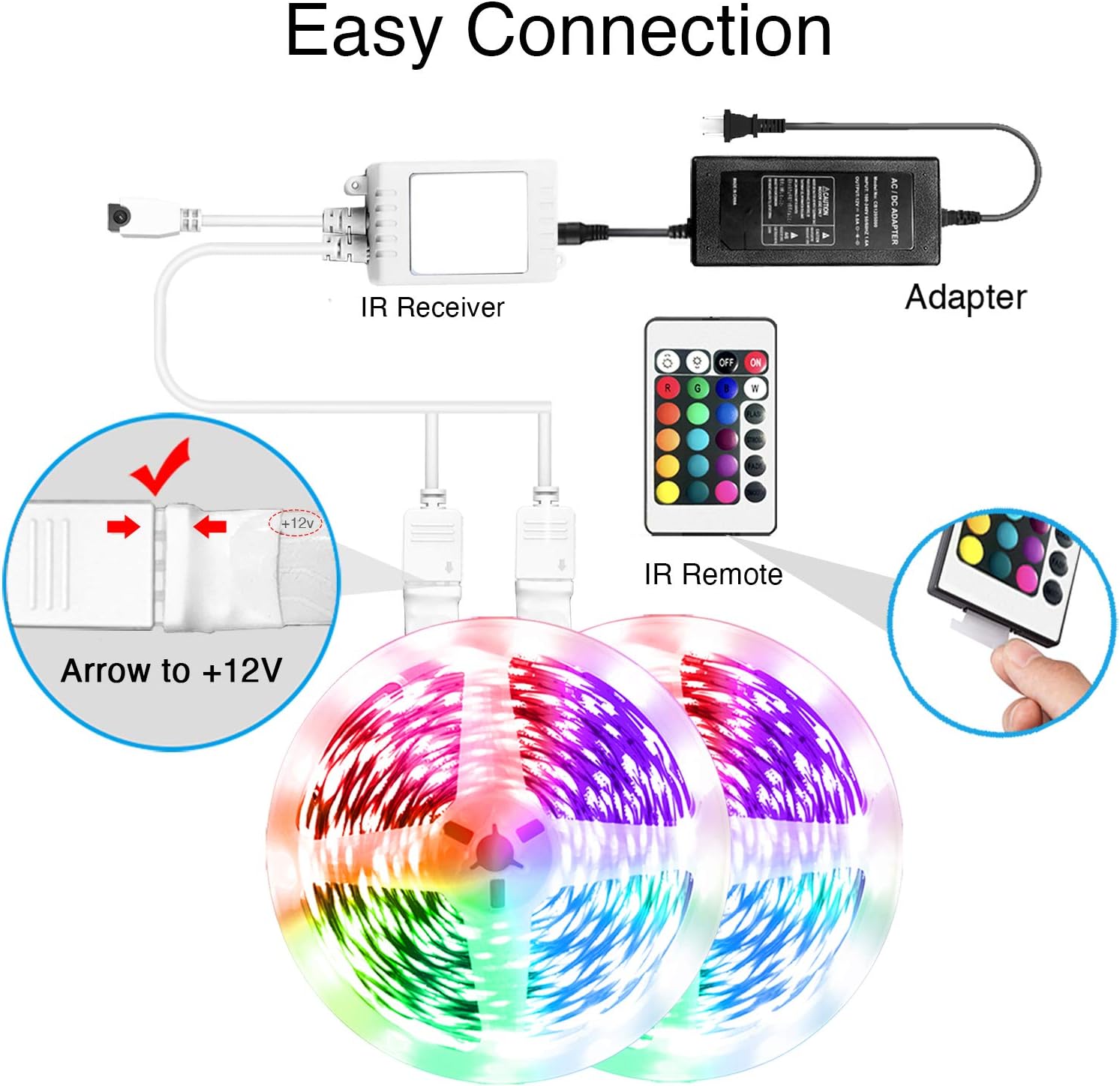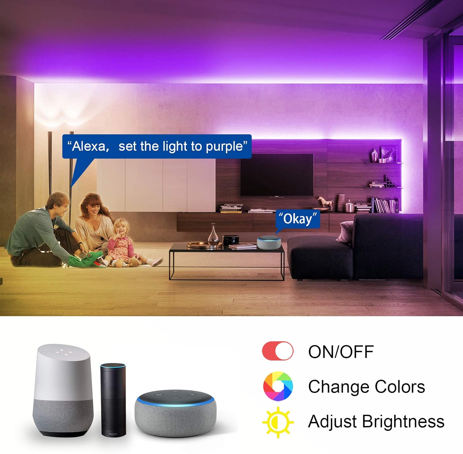 Smart IR Remote Control: You can control your smart room lights via more smart ways besides the IR remote; you can adjust brightness, change colors, turn on or off the 65.6ft color changing LED strip lights with the smart app, you can also use Alexa or Google Assistant to easily control your Alexa smart LED strip lights