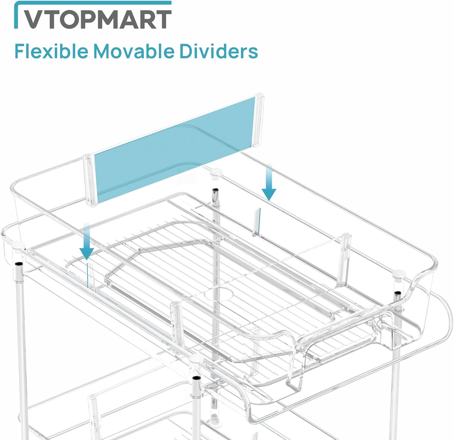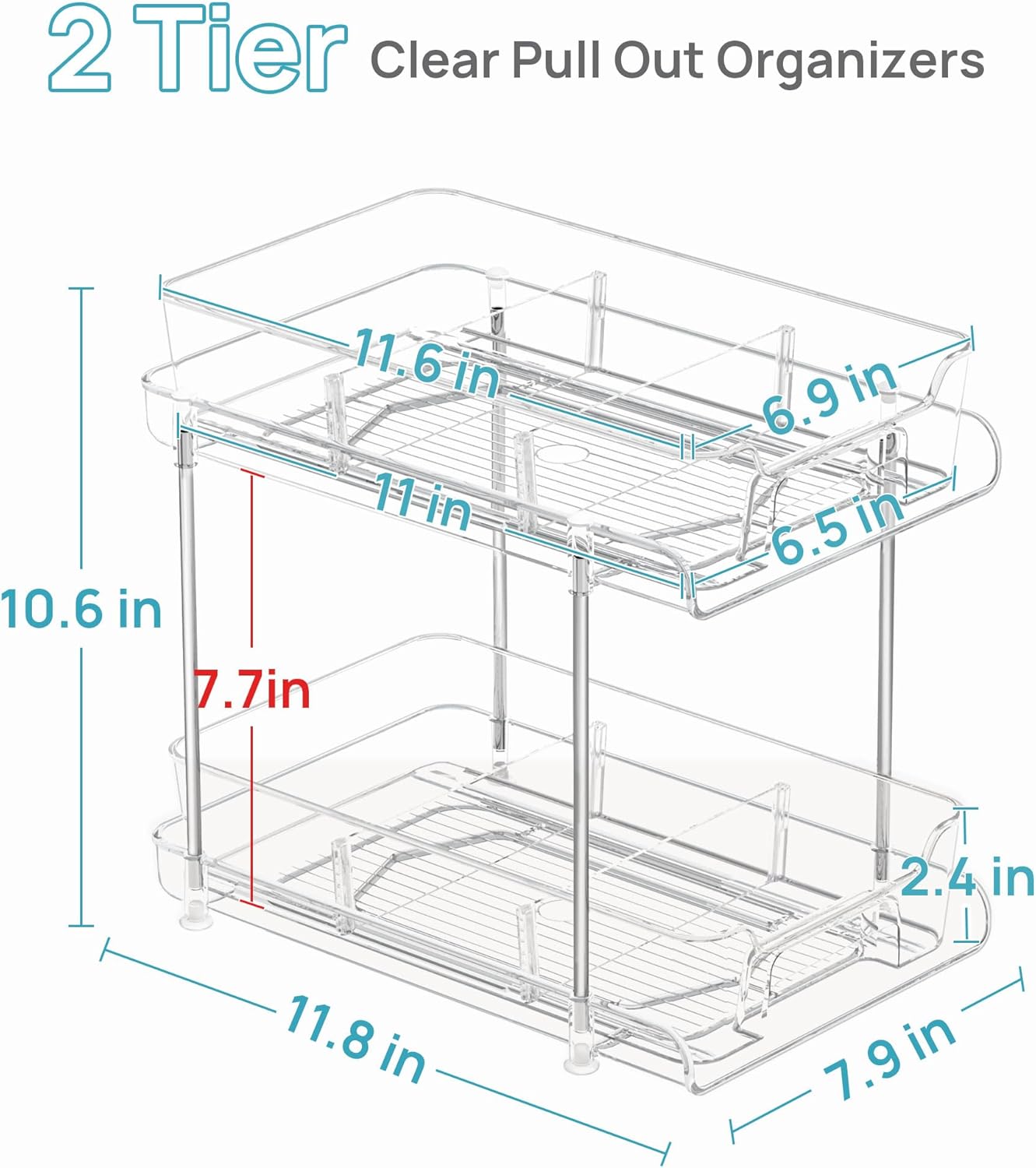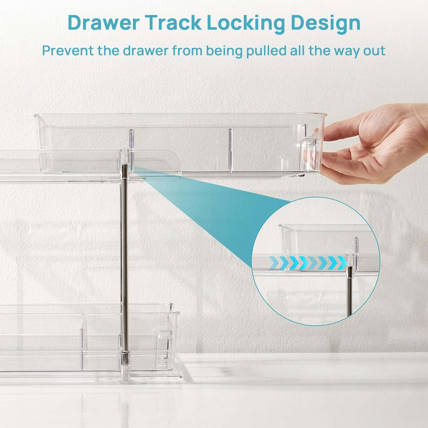 MULTIPURPOSE CLEAR ORGANIZER: Our 2-tier sliding drawer organizer with dividers is a great solution for family storage needs. Offers versatile organization options for various spaces in your home, which can be effectively organized under the sink, pantry, medicine cabinet and refrigerator. It is a practical and space-saving solution to keep your belongings organized and easily accessible.