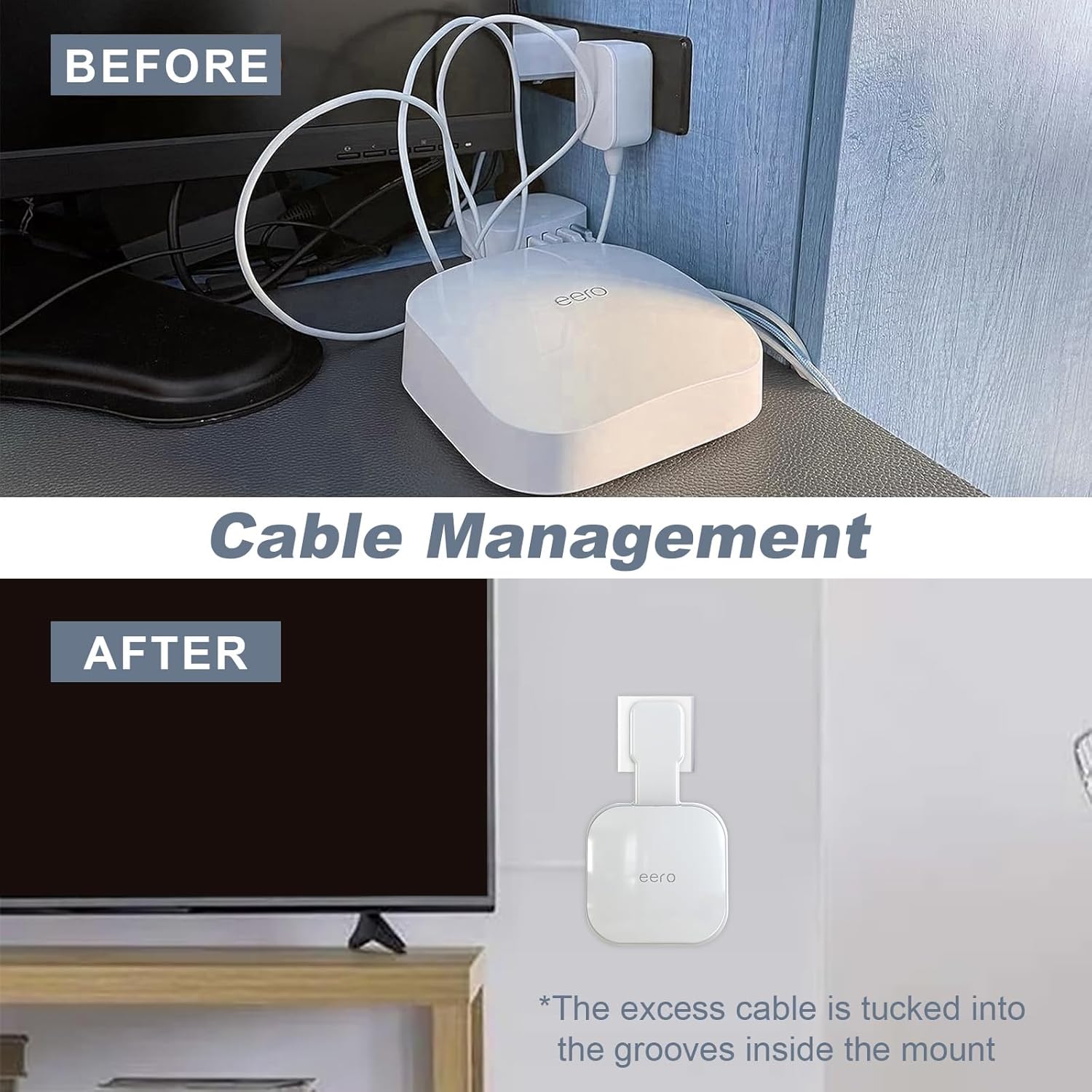 Cable management: Eero Pro 6E/Pro 6 wall assembly support is designed with a cable slot. You can wrap and hide the cables in the slots in the back of the wall support. Save space and keep your room ordered at the same time.