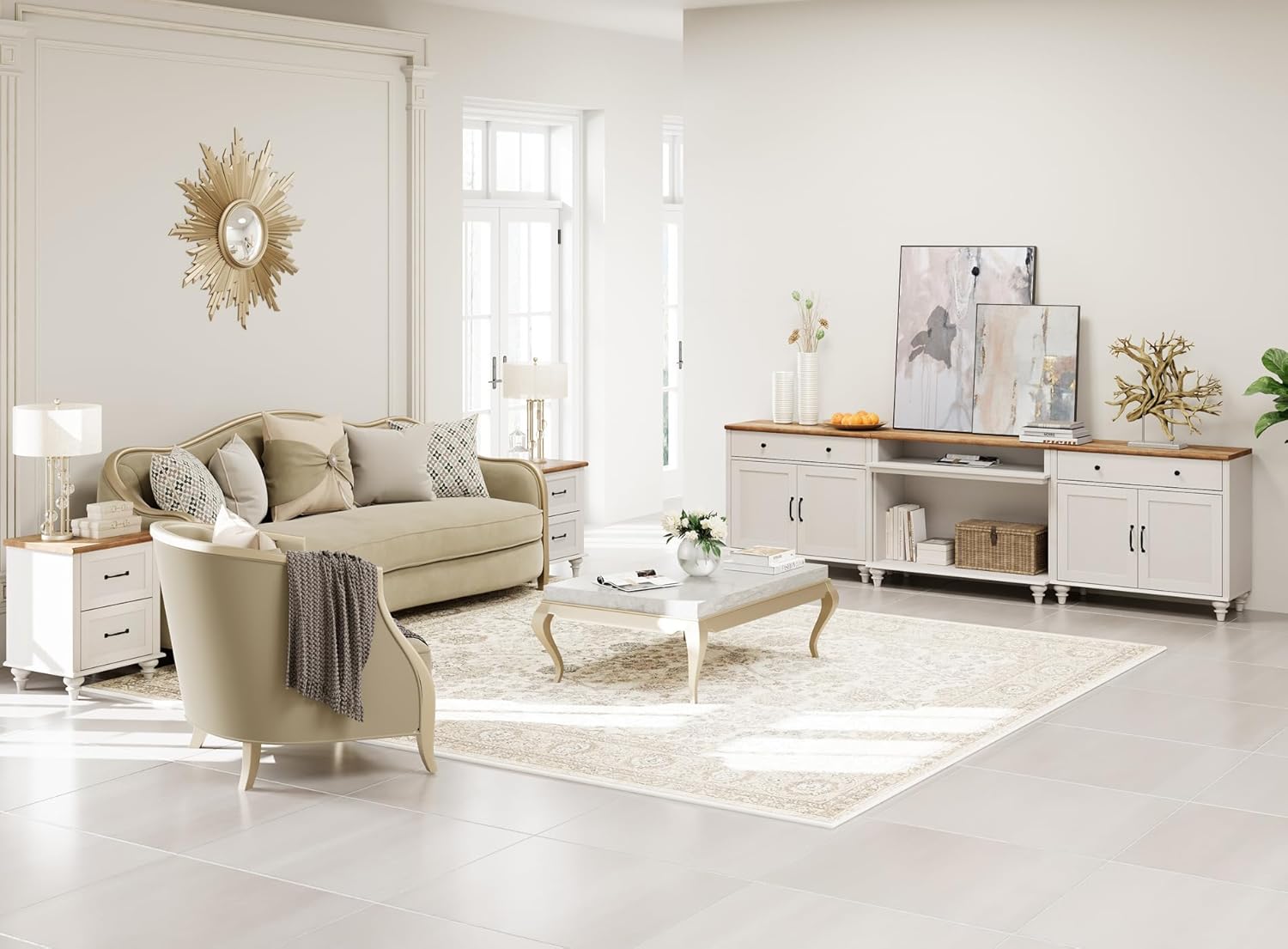 【Elegant appearance】 With the whitewood surface worn and the style of mid -century, TV support for 100 -inch TV is a perfect choice to add a touch of high -end charm and elegant to your room. Appointed with curved edges you can avoid accidental injuries, especially for families with children, to prevent their children from playing with the boat.