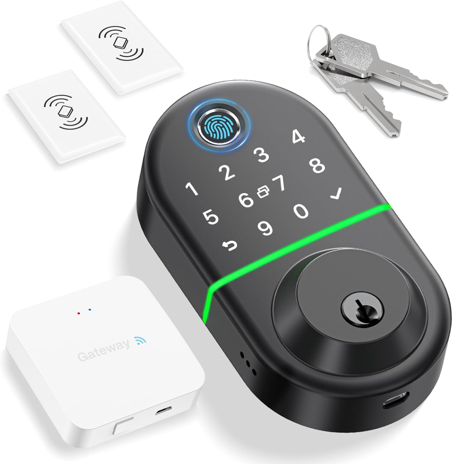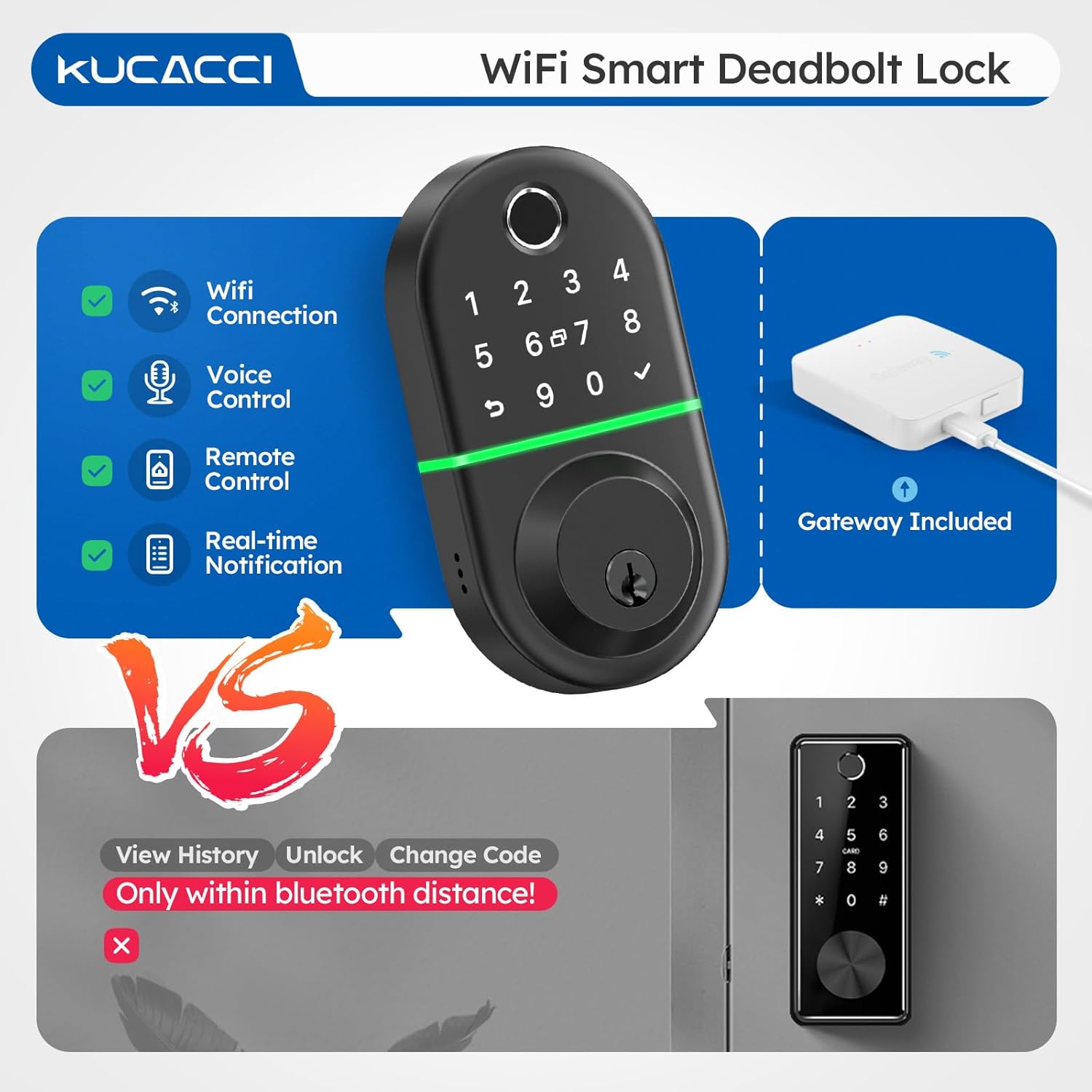 🔥【 Multiple access to the keyless entrance】 Come with your Wifi Gateway, you can enjoy various access options: digital footprint, tactile panel password, application, FOB key, physical key, Alexa's voice unlocking and remote unlocking. Gateway only admits 2.4g wifi network.