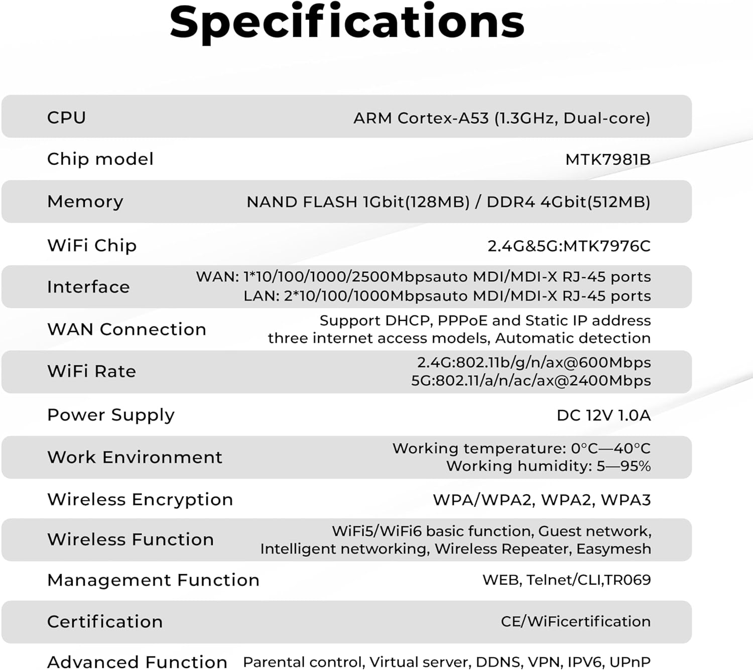 Wireless function: Basic WiFi5/Wifi6 function, guest network, smart mesh networks, wireless repeater, easy mesh. Wi-Fi rate: 2.4g: 802.11b/g/n/ax@600mbps, 5g: 802.11/a/n/ac/ax@2400mbps. CPU: ARM Cortex-A53 (1.3GHz, dual-núco) Chip Model: MTK7981B Memory: Nand Flash 1gbit (128MB)/DDR4 4GBIT (512 MB) Wi-Fi chip: 2.4g and 5g: MTK7976C WAN interface MDI/MDII ports; LAN: 2*10/100/1000MBPSAUTO MDI/MDI-X RJ-45 Maintenance of the System System: Device Management, Configuration Management, Update Management, Registration Function, Status Statistics, Restart/Reset. Advanced function: parental control, virtual server, DDNS, VPN, IPV6, UPNP certification: FCC/CE/Wi-Fi certification.