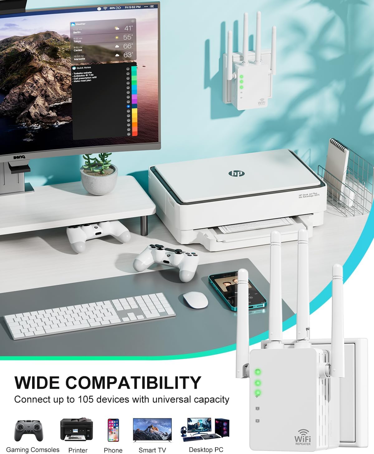 Universal Compatibility: Up to 105 Devices: The signal booster and Wifi signal booster support 105 devices that can be used with many standard WiFi routers and many WiFi-enabled devices, and easily connect to many newer routers. It can maintain a strong connection with mobile phones, smart TVs, garage doors, doorbells, cameras, etc. The WiFi repeater and signal booster easily extend the range of your home experience, wired speed and reliability on any WiFi network.