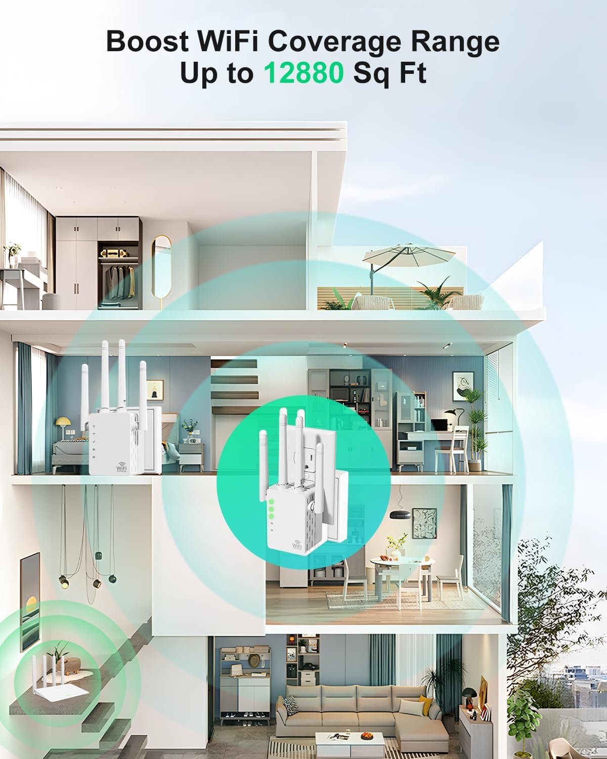 Covers up to 12,880 square feet, no more dead zones: Our WiFi extenders easily extend the range of your home WiFi network and keep all your mobile devices connected without having to buy more equipment. You can penetrate obstacles such as floors, places in rooms, basements, garages, bedrooms, with weak WiFi coverage with our WiFi range extender, extending your wireless Internet network to every corner of your home for online gaming, video chatting and even streaming. 4K. High definition video.