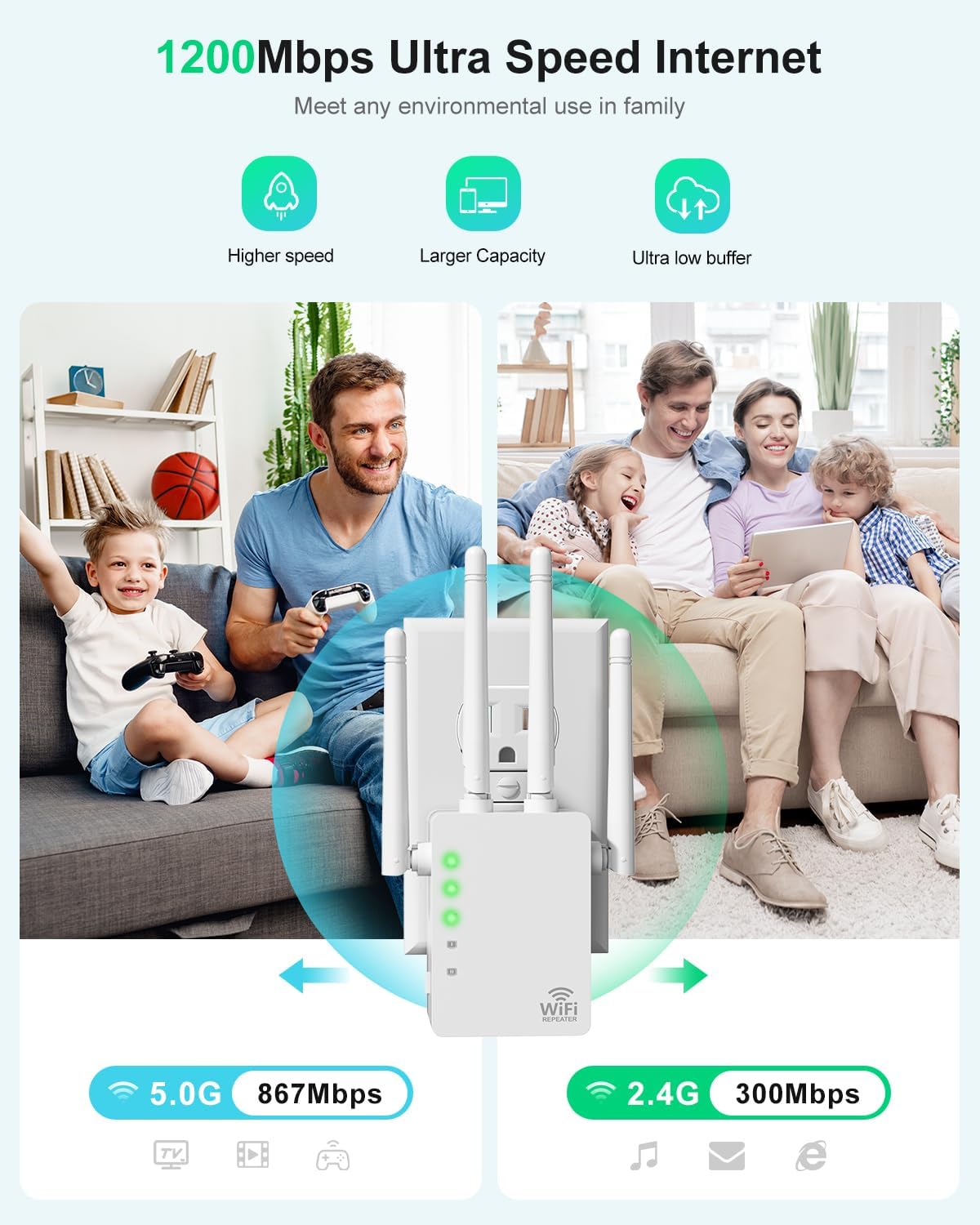 High-Speed Extended WiFi Coverage: This WiFi extender with 4 directional antennas and the latest dual-band technology will expand your existing network to hard-to-reach areas, speed up to 1200Mbps, create a remote, stable, high-speed network and good performance . Our WiFi extenders are designed to give you wider signal coverage, eliminate WiFi dead zones, and deliver an available and stable network – no more network delays! Enjoy HD streaming and smooth gaming experiences anywhere, indoors or outdoors.