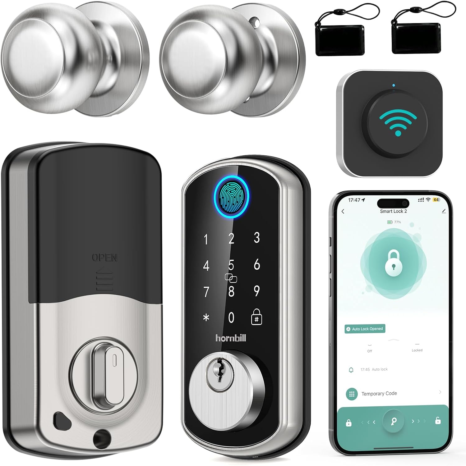 WiFi Smart Door Lock Set: Hornbill Silver Keyless Entry Door…