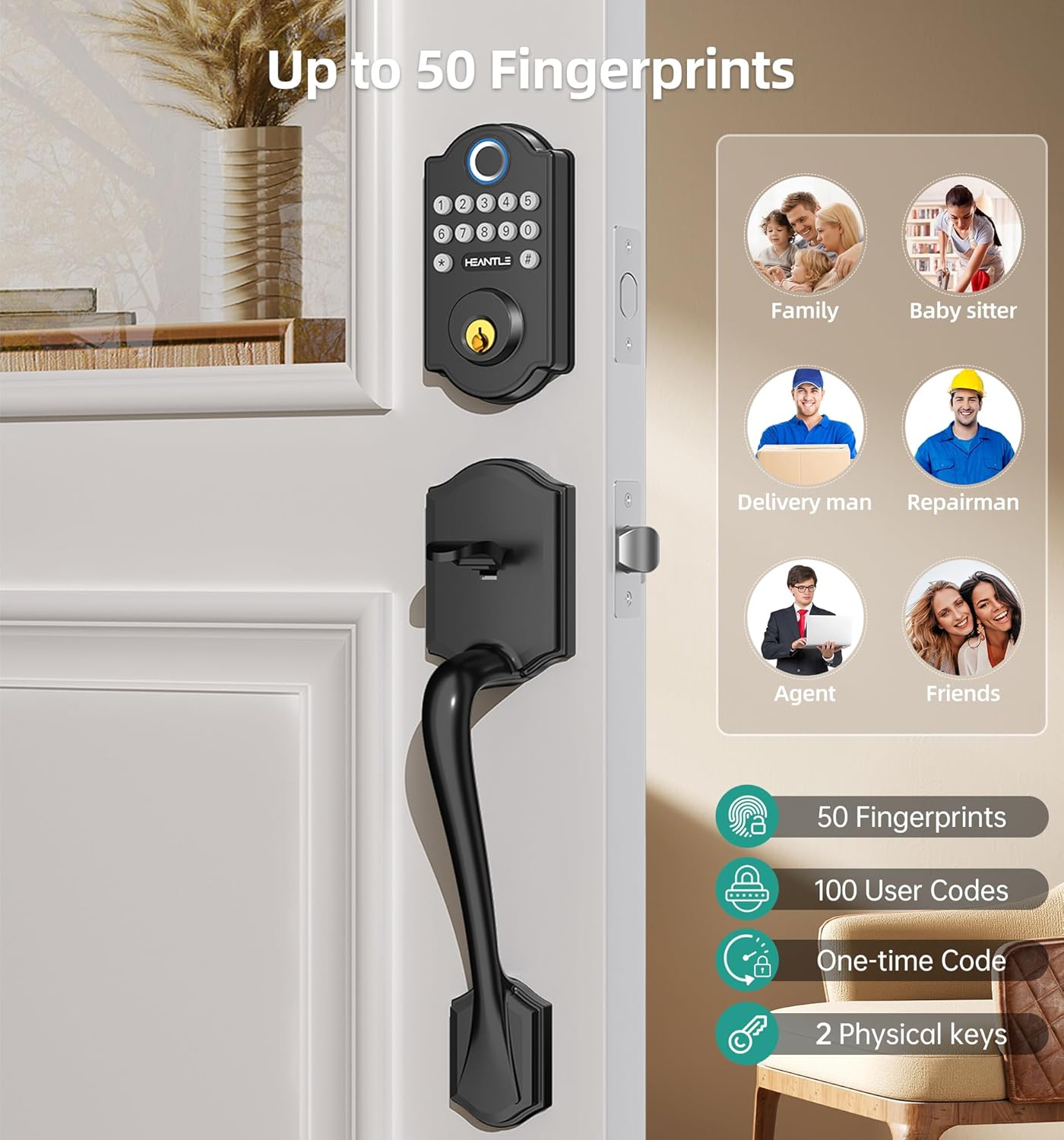 Smart Access Management: Manage up to 50 fingerprints and 100 user codes. Generate and share unique, time-limited, permanent and scheduled codes with your family, house sitters and guests. Perfect for homes, apartments, offices and hotels.
