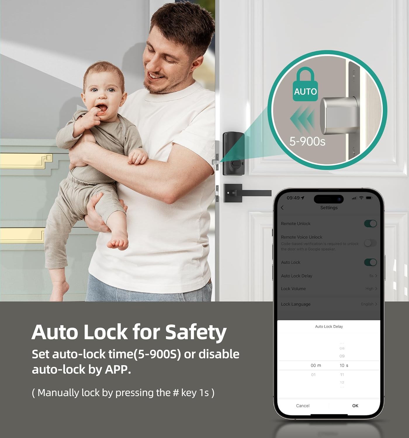 Automatic locking for added security: Monitor the status of the electronic door lock anywhere via the app. Easily enable/disable auto-lock with one click and set auto-lock delay (5-999s). Lock manually by pressing the # key for 1 s or by turning the inner button.