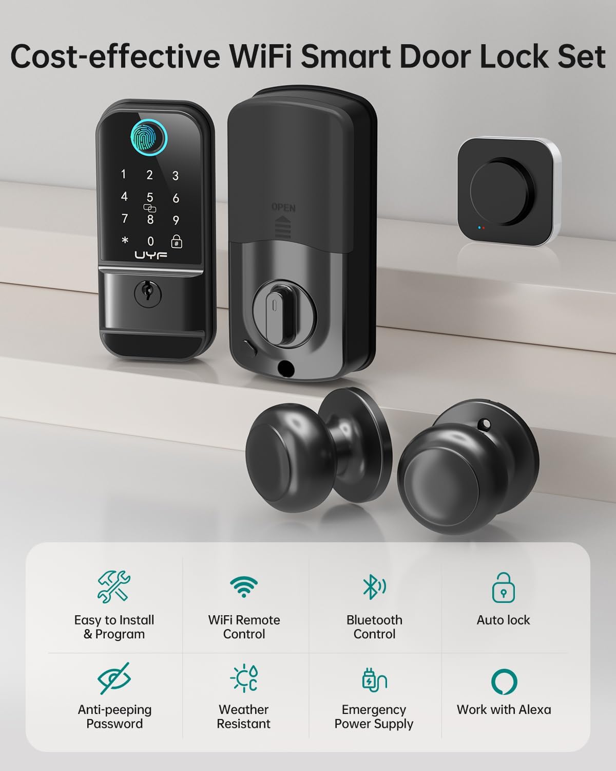 Increase your home security effortlessly with our WiFi keyless entry door lock, equipped with 2 knobs for added convenience. Enjoy the ease of keypad code, remote control, physical key, 360° fingerprint, Bluetooth app control and Alexa/Google Home voice control. Say goodbye to the worry of being locked out – experience the freedom of keyless entry and the security of a smart door lock that puts seamless access and security at your fingertips. Improve your home security with confidence and convenience!