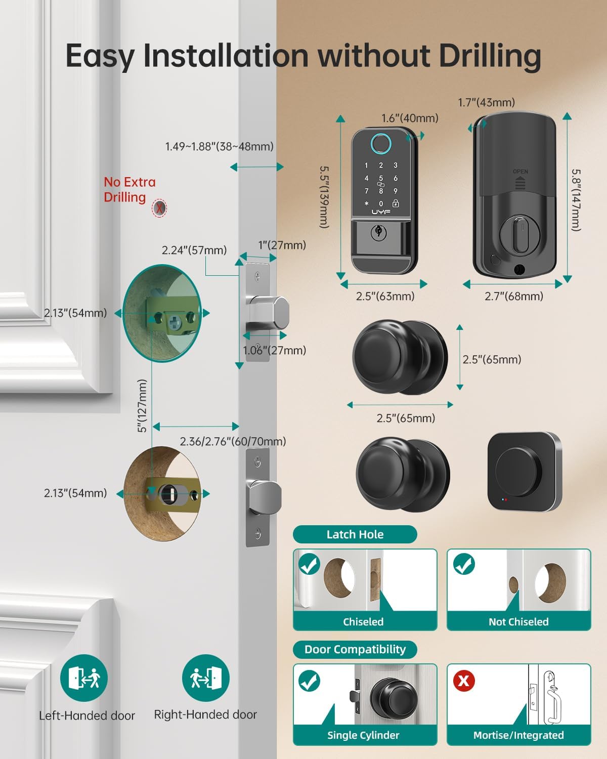 Easy to program and install: no need to drill additional holes or use a locksmith; All you need is a screwdriver and a few minutes to install it effortlessly. Simply follow the user manual and our VOICE GUIDE will guide you seamlessly through the entire setup process. Designed for standard left and right doors, our smart lock provides convenience and security at your fingertips. Enjoy a hassle-free experience with our easy-to-use installation process.