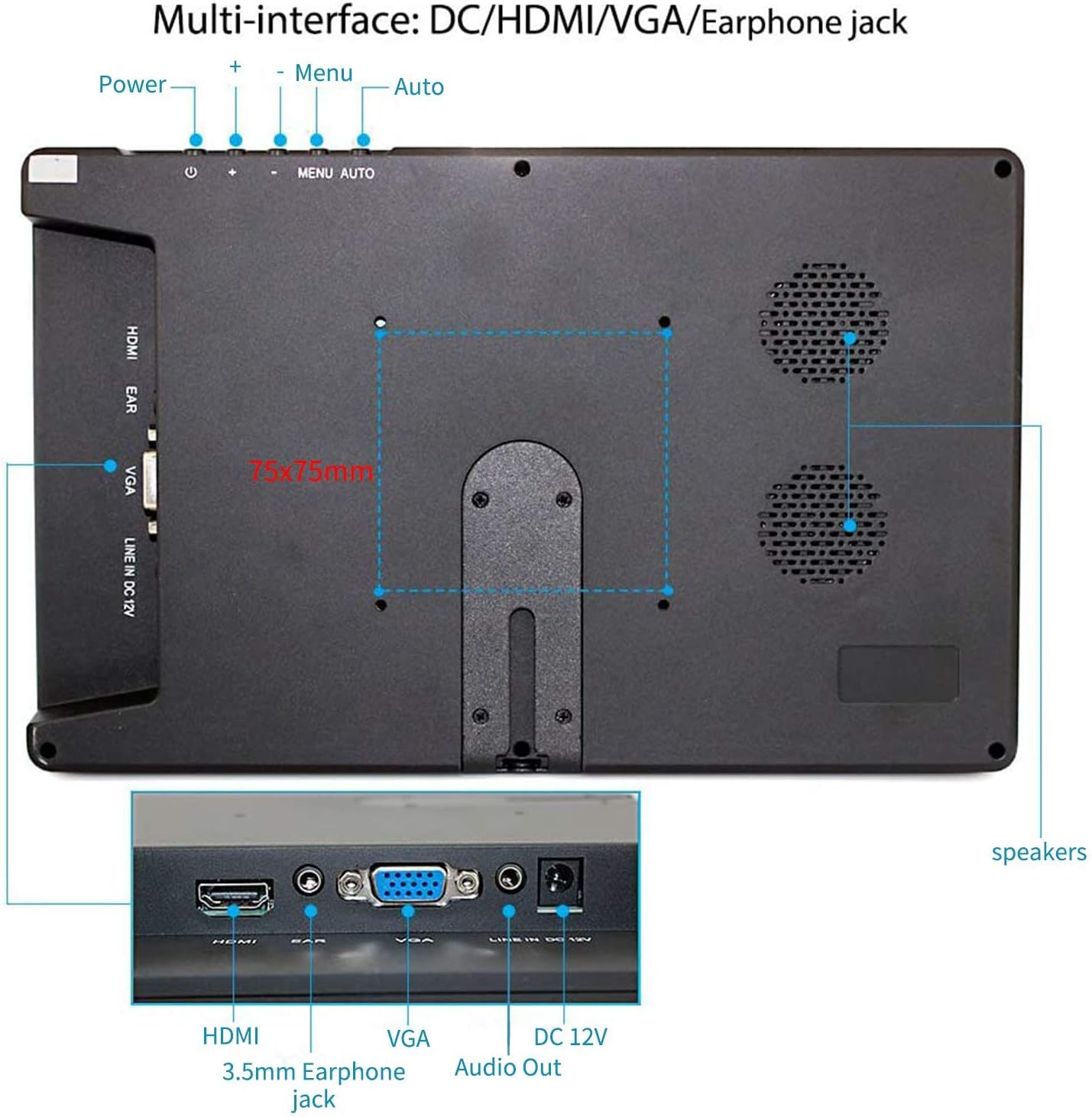 Specifications: Aspect ratio: 16:9 Brightness: 400 nits Contrasts: 1000:1 Active areas: 234.72 x 132.03 mm Viewing angles: V/H 85 degrees, L/R 85 degrees Video input HDMI input Input VGA Audio input and output Built-in Audio input and output for 3.5 mm ear jack. Built-in Dual Speakers (3wX2) Dimension: 263x168x31mm Package Dimension: 34x33x8cm VESA Mount: 75mm*75mm Package Weight: 2.5kgs Package Included: 1X10.1 inch HDMI VGA Monitors 1XStand 1X12V 2A DC Adapter 1XHDMI Cable