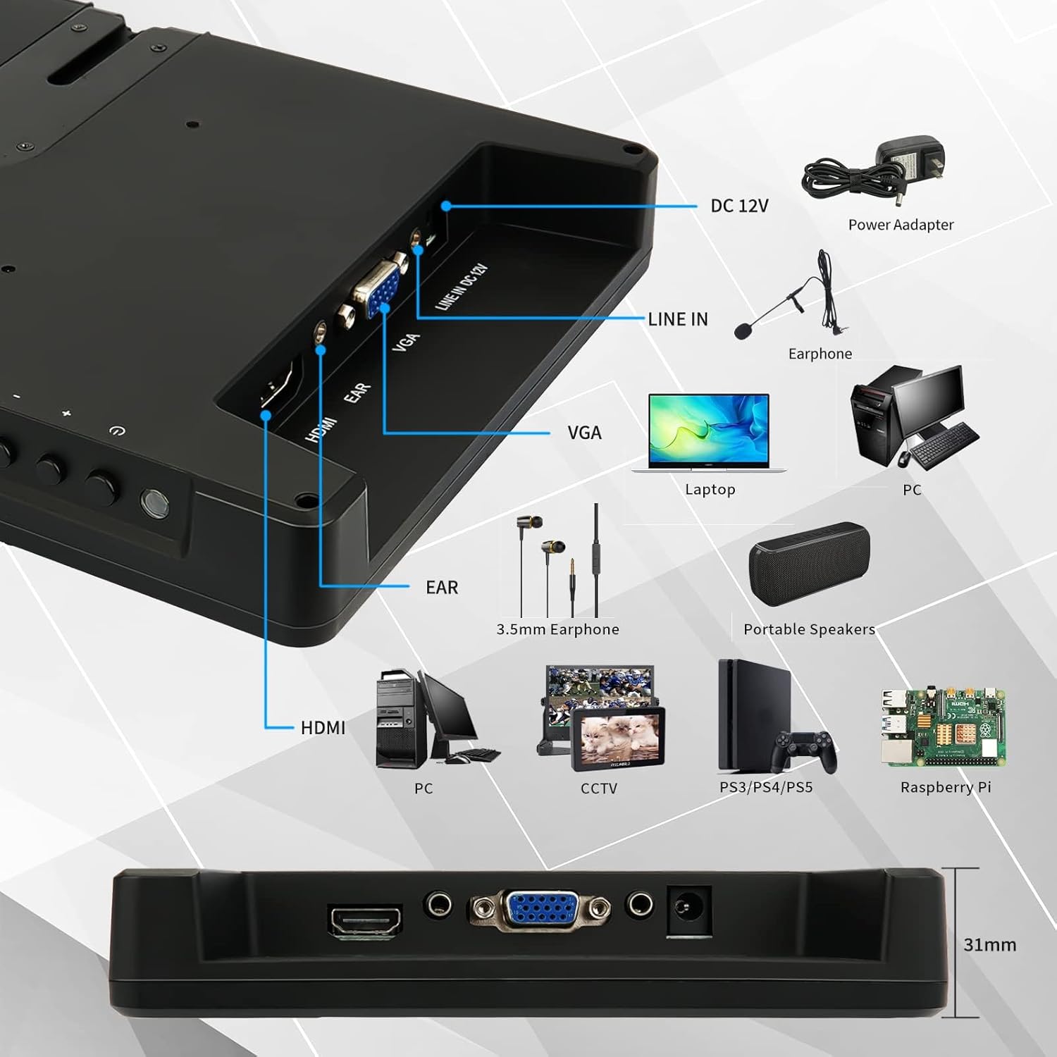 Supports HDMI and VGA signals. Wide applications for DSLR cameras, recorders, CCTV, PC, car headrest player, PS3, PS4, Xbox 360, Raspberry Pi-3, etc.