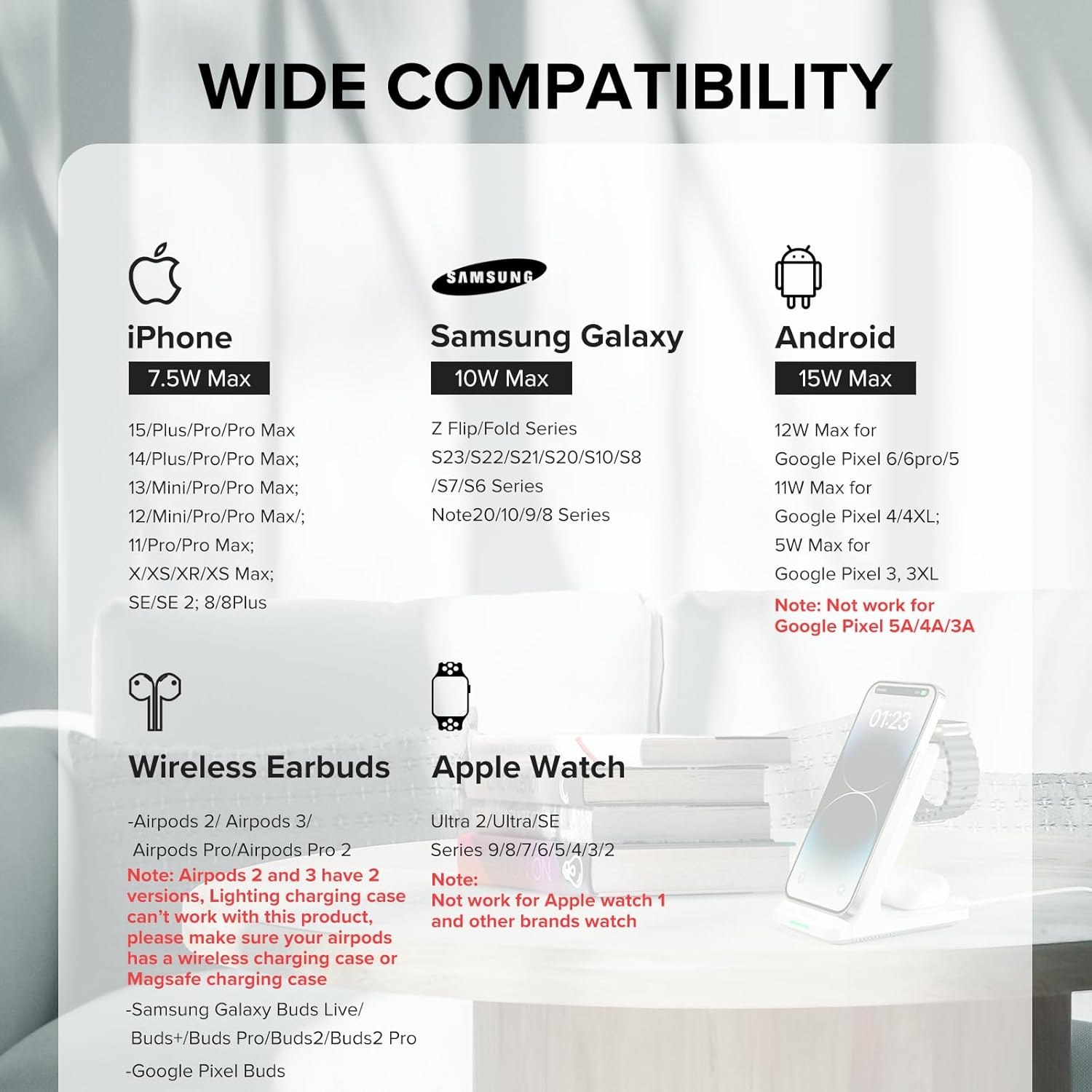 SAFETY & EFFICIENCY: Aukuse 3 in 1 wireless charging stand is designed with comprehensive protection; it provides over-charge, over-current, over-voltage and foreign object detection protection to ensure safe and harmless charging. With up to 15W power and excellent cooling system, it can improve charging efficiency, making your cell phone charge faster than the average 5W wall charger.