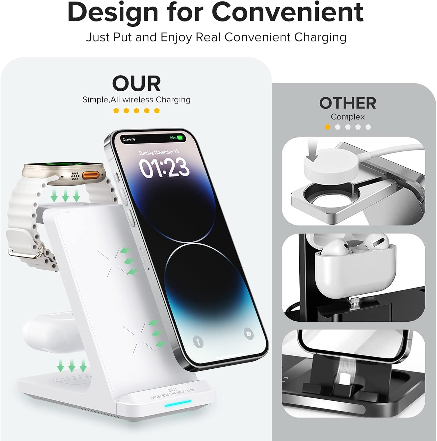 SAY GOODBYE TO MESSY CABLES – No need to search for all your devices' cables and adapters anymore. Now with just one cable and our 3 in 1 fast wireless charging stand, you can have a tidy desk and keep your favorite devices fully charged. Just place your devices on our wireless charger at your leisure and then be ready for whatever the day throws at you.