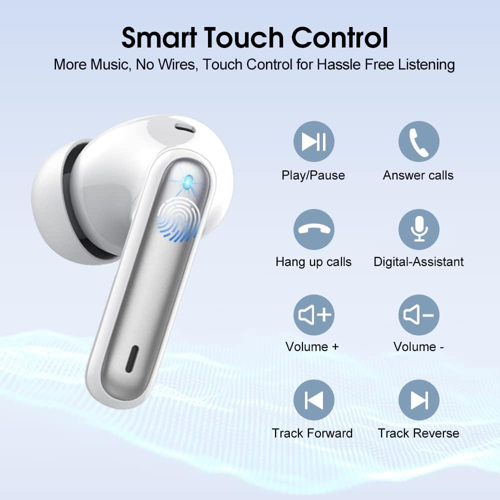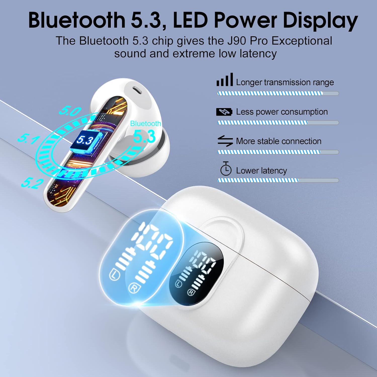 Touch Control and Ergonomic Design: J90 Pro wireless Bluetooth headphones are equipped with sensitive touch control panels on the left and right earbuds, allowing flexible control of music playback, answering or rejecting calls, adjusting the volume, switching between music, etc. They come with 3 different sizes of ear tips (S/M/L) and a unique ear cap design that disperses pressure and ensures a comfortable fit, allowing you to enjoy your own music safely and without no discomfort.