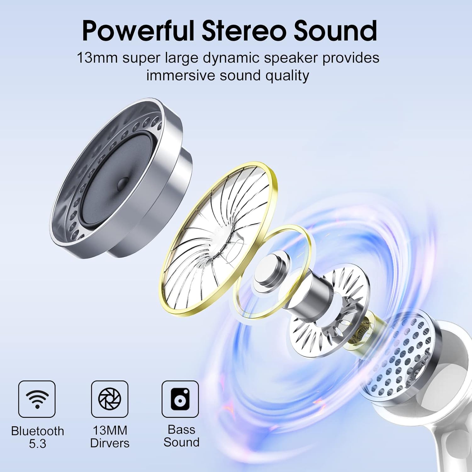 Surround Sound and ENC Noise Canceling Microphones: These wireless headphones adopt a unique stereo design with 13mm large composite diaphragms and AAC codec to produce professional quality sound. The Bluetooth headset is equipped with dual ENC noise reduction microphones to passively cancel 80% of background noise, allowing you and the caller to hear each other better and make clear calls with minimal background noise.